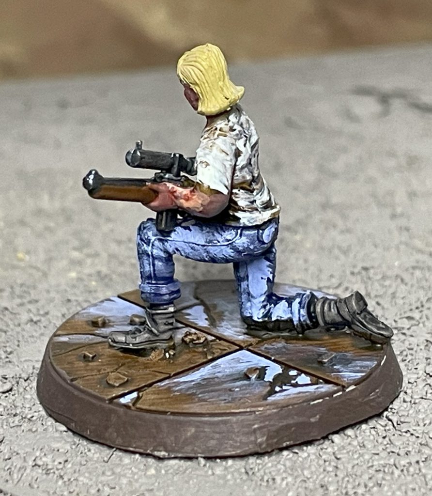 I didn’t want to stick to the patterns and colours of the Slog characters, so I went with a fairly standard fallout-ish palette of browns, greys, greens and blues. I wanted really high contrast to give a kind of comic book effect with the highlights, but didn’t fully commit to it and as a result didn’t really pull it off. There’s nothing particularly special or indeed that interesting about the cloth and clothing – paint it as you like!