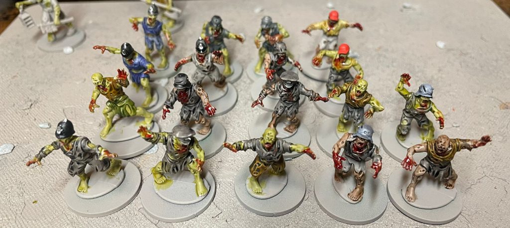 The Zombies were an all-club effort, including some frantic late-night painting sessions on my end to get enough ready to make them feel like a horde. We ended up with about 60 – all of mine from the fantastic Wargames Atlantic Zombie kit, made to represent the various fascists kicking about in the world today. They were pure contrast paints in greys, blues, reds and blacks, later to be flocked with classic retro green sawdust:
