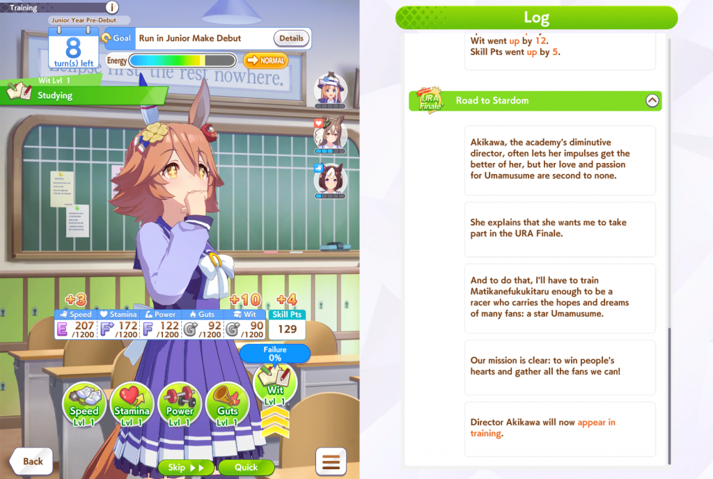 Another important note that helps lessen frustration if you have found your Career winning Umas not pulling their weight outside of the career mode itself is that Career mode gives a flat 400 point boost to all stats, meaning that the game pads your stat spread to help you complete the campaign (but, importantly, ALL Umas in career mode get this boost as well, if you are wondering why you can still have trouble winning). This often leads to a little bit of shock when your Gold Ship dominates her career run but then loses every Long race you put her on after the fact. There are other factors, such as the baseline RNG of the game, that can also lead to losing, so it’s important to recognize that even with perfect stats, your racer may just not win a race sometimes.