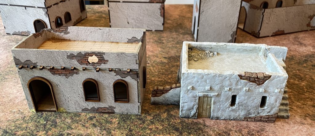 I also had a go at adding a little more three dimensional detail to one of the houses – very simply adding some scattered sand piles under areas with the damaged plaster graphic and adding some static grass around the base. Roughly covering the MDF edges with a vaguely similar paint was the next step, and I think it’s classed up the already fantastic terrain and made it blend nicely into my board. With a little scatter, some trees, possibly some roads and paths, I think this is just a bloody gorgeous set. I could barely tear myself away from the photography, which is why this is the best illustrated article I’ve ever written.