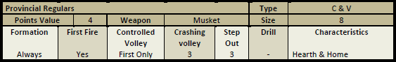 You can see how bad these guys are – hard to get crashing volleys and step out, lack of special rules, conscripts and volunteers. They do have the ability to stay in formation always, though. Hearth and Home basically makes them a bit better if the scenario takes place in their own state. If they are not in their own state then they are Weedy Coves, which makes them worse at fisticuffs.