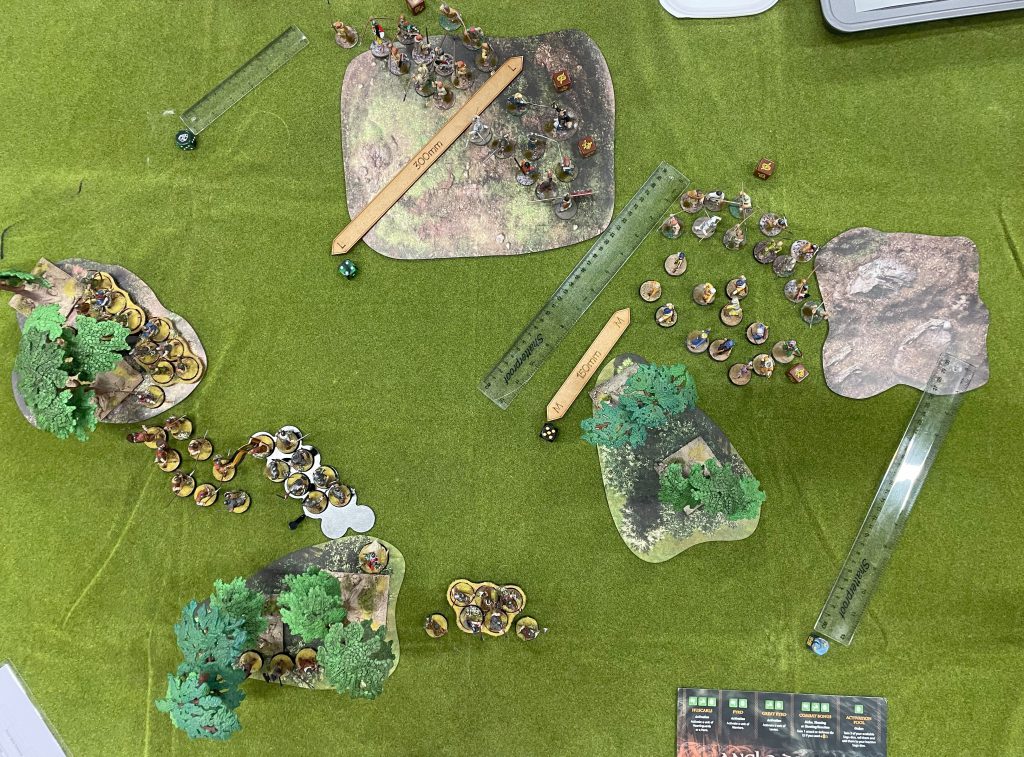 I absolutely succeeded on my “win one victory” aim, but possibly a little too well. After one game I had more points than anyone else playing, so ended up on top table playing Andy – one of England’s Saga World Cup team, and generally a fantastic opponent to play. I endured a fair bit of ribbing on the way into this one as the Grand Melee is a fairly tight knit community – about half of it being “crush him, he’s not as good as he thinks” and the other half being “alright at least it will be quick!”. We played the Advance scenario, which was all about capturing objectives in the enemy half of the table. My plan was to…. Well, capture some objectives? That’s as much as I’d thought about it, if I’m honest.