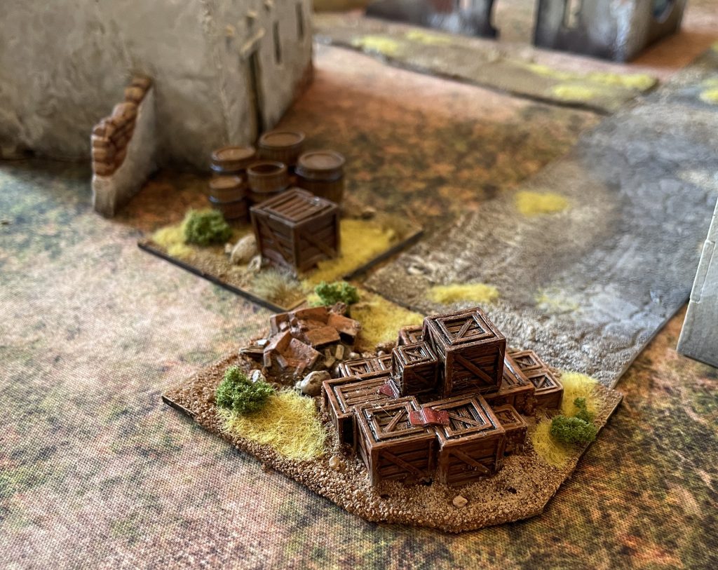 The storage scatter is very much what I had available, rather than any attempt to make things look era appropriate, but I figure that barrels and boxes are probably at least fairly universal. I should really be looking for some wicker baskets, perhaps even an amphora or two, as these are so generic that they really could be anywhere – not really what I want, but good enough.