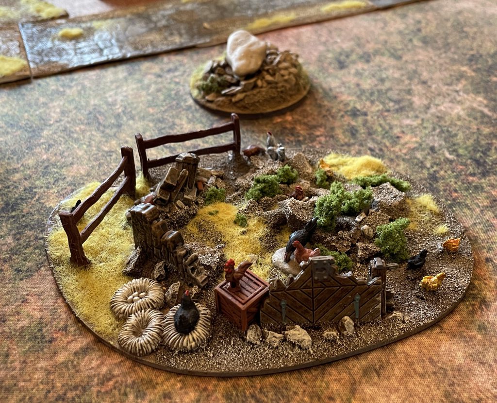 The Goat herd and Chicken roost are both practical pieces for games of Pillage, where herds of sheep/goats are a serious threat and chickens potentially an explosive chaos agent (look out for house rules for this soon!). They’re various metal and 3d printed animals on large irregular MDF sections from warbases. In other games they will work as rough/broken ground and add a lot of character to the table. I’m a little reluctant to add fields and field boundaries at the moment, at least until I can get a firm handle on what these looked like in the 10th century, so animals are a good way of showing that this is a farming community.
