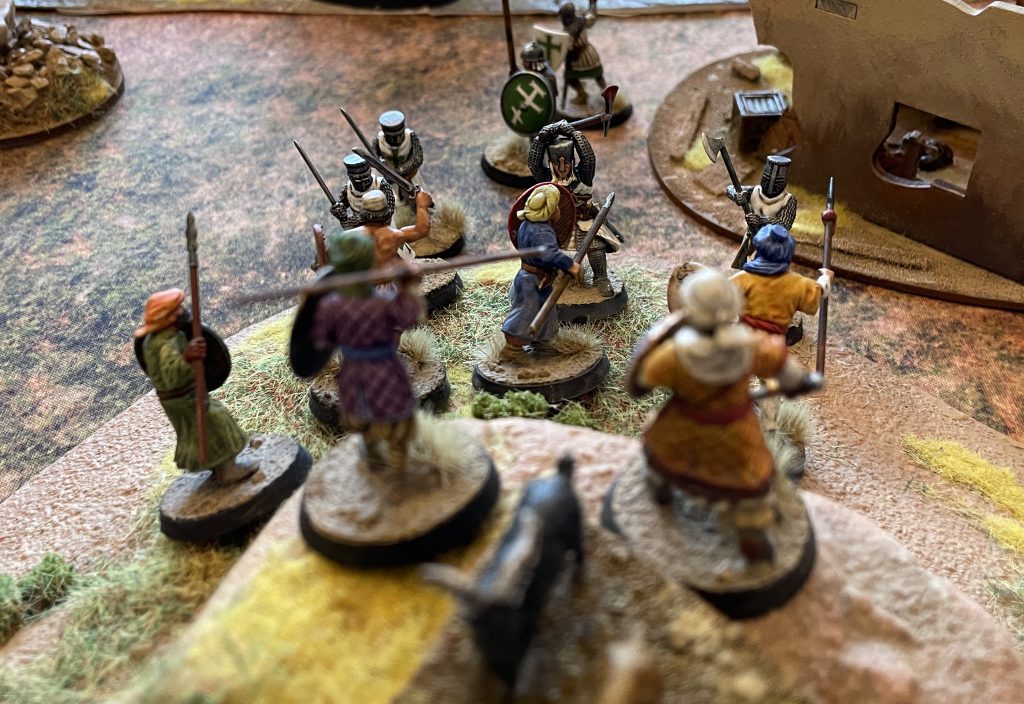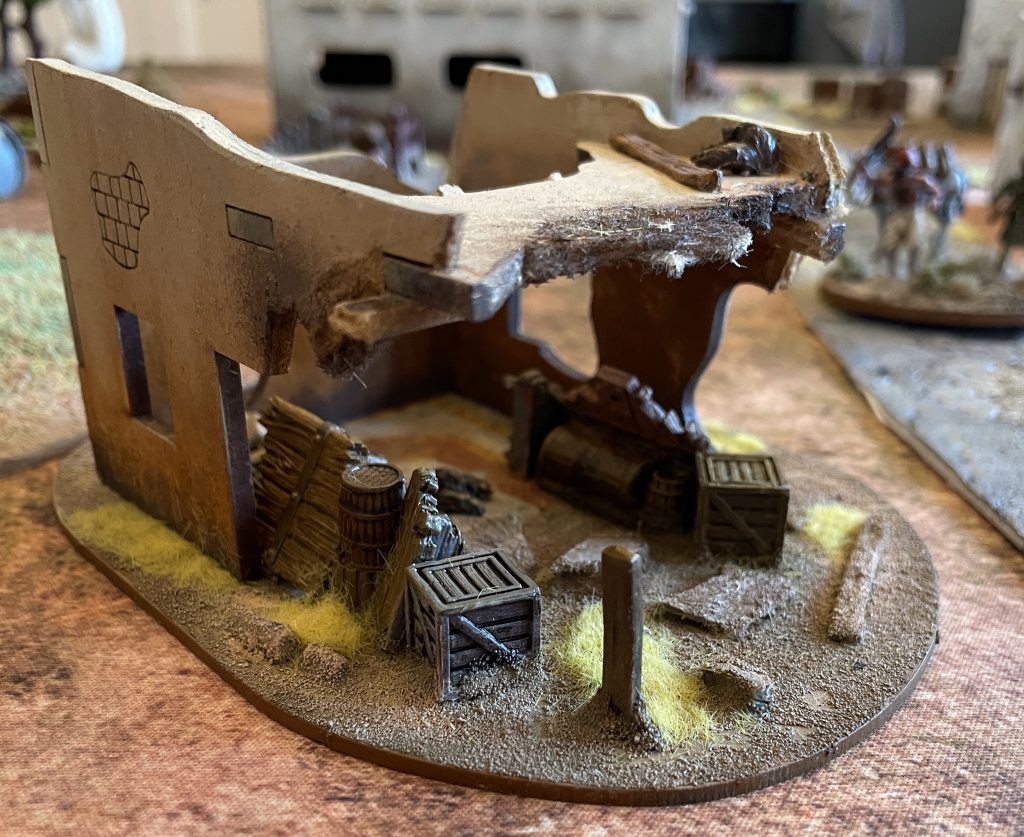 The final bit of scatter returns to the Romans. I was a bit unsatisfied with how quickly I’d skipped over the entire period last time, so I thought adding a ruined building with a Roman feel would be a shorthand way of changing things up. Perhaps this is Byzantine, Roman or Ptolemaic, but either way it’s a marker of a slightly different way of doing things in the area that has now come to an end. It’s a mix of a spare mdf building, Mantic scatter terrain, Warbases base and some dodgy mosaic painting make this either a very small building or the entryway to a more significant one. Either way, it’s a nice reminder of things long past being used in the present – the palimpsest effect all in one ruin.