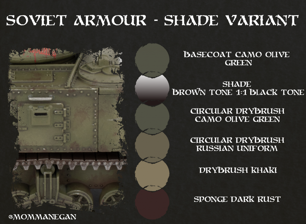 That is it really for painting the green on your Soviet vehicles. This works for almost any tank, vehicle, and even artillery. Obviously this isn’t it for the model, you still need to paint the tracks and stowage. Stowage varies so I’ll leave you to figure out how to paint that, but if you want to know how I painted my tracks, here’s a super quick recipe: basecoat with Dark Rust and then drybrush with a dark metallic color. It’s that simple.