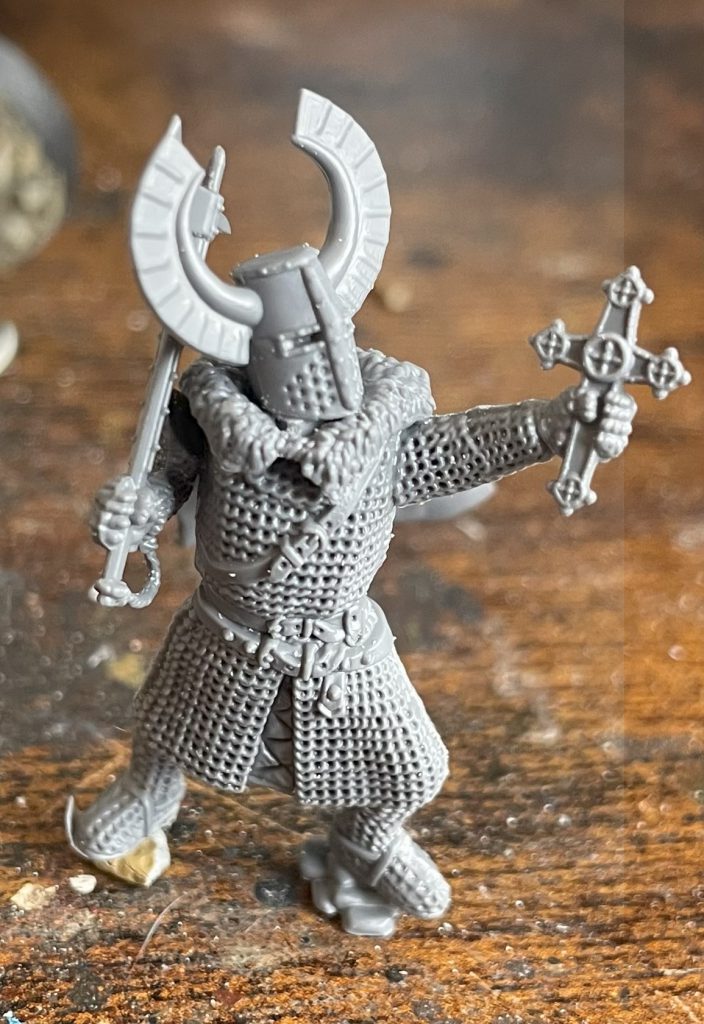 All of the heads work on 6/8 bodies on the foot knight sprue. The Cloaks – absolutely intended for the Mounted Knights – work really well for a kind of Hollywood dynamism on the foot knights. I’ve stuck them on to give that whole “cloak billowing in the wind” look, as if they’ve walked out of a shampoo commercial or raging storm.