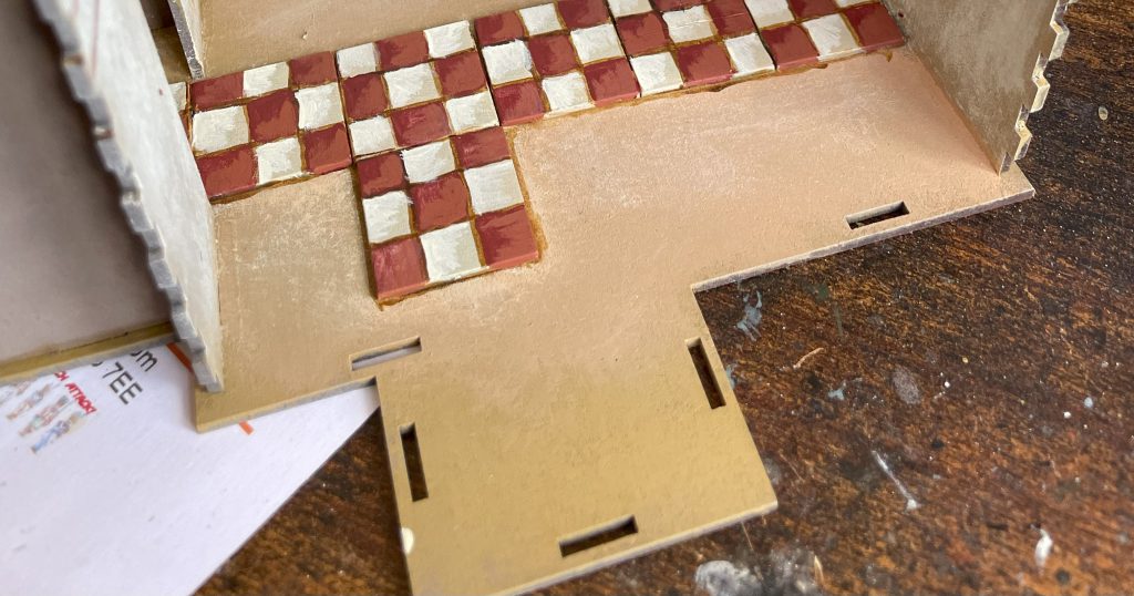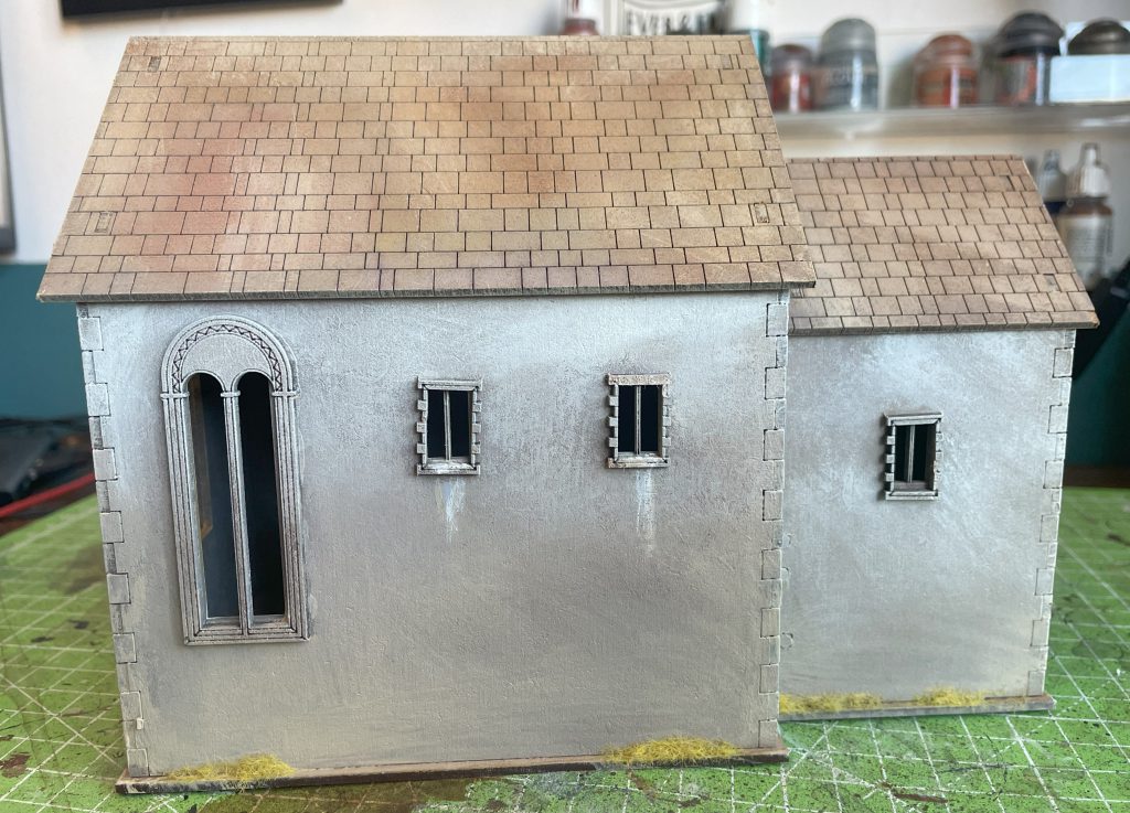 The church will eventually feature in my Village in the East series, but I wanted it to look generic enough to fit in to North Africa, Sicily and even a very hot summer in the UK. I read a couple of sources suggesting Norman and Saxon churches were variously plastered, lime washed, mud-plastered or otherwise smoothly dressed depending on area, so I’ve adopted that rather than trying to paint a lot of stone/flint/block texture onto flat MDF. As a result, painting the exterior was very easy, using my biggest oldest drybrush to layer my Egypt Building colours onto it – up through the light skin tones to white from yellow ochre. The roof tiles received the same with a little extra brown and even less attention to detail. It’s all blended together quite nicely.