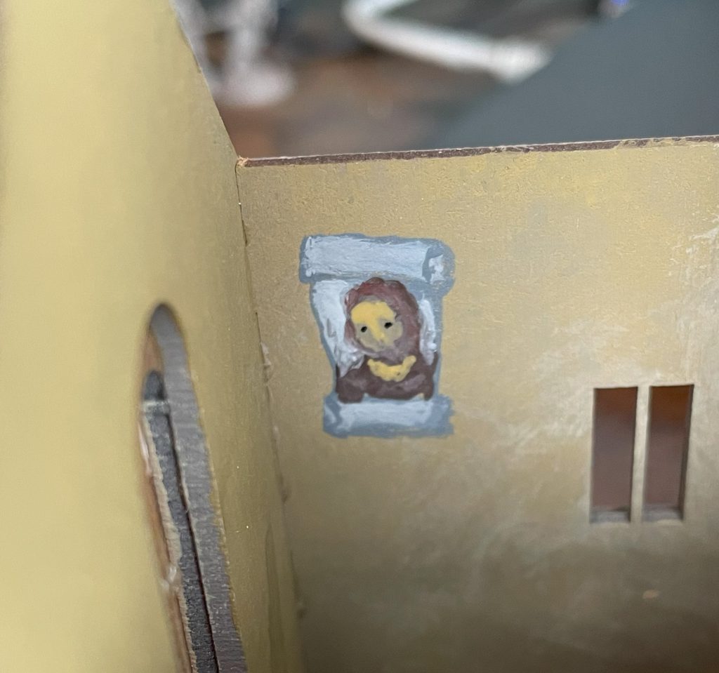 Detailing the exterior was relatively simple, adding a bit of faded-looking colour to arches, a bit of pigeon shit on windowsills (tiny blobs of milliput and paint), and some staining around the door and windows with washes. I also added some very simple rows of swallow nests out of modelling clay to the very very edge of the roof over the nave. Adding any more would likely make it difficult to take the roof on and off, but if I wasn’t doing a removable roof I would have gone absolutely crazy with swallow nests and bat roosts.