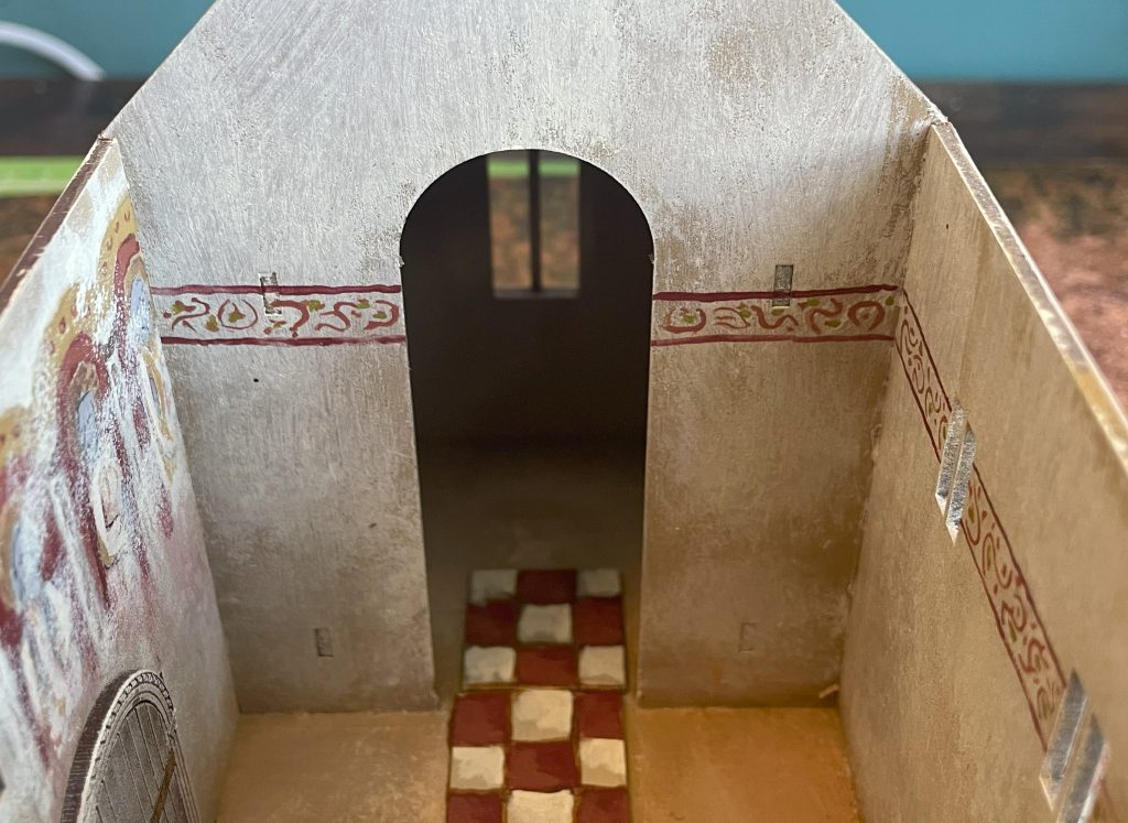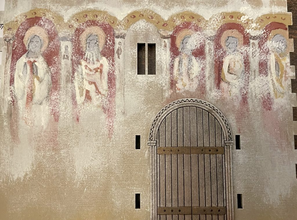 Interior detailing was much more fun. Keeping the Chancel a bit darker with just two colours on the walls, I thought it would be a good idea to push the Nave decoration a bit more. This includes a band of pseudo-arabic that would suit a Sicilian or Crusader church – mainly because I love the idea of pseudo-arabic decoration when people looked at islamic calligraphy and thought “how beautiful” but couldn’t read the writing so just copied the shapes roughly – and a frieze of saints inspired by Romanesque art. These churches would have been richly – if not always expertly – painted, and with a large flat space and the saving grace of the weathering sponge, I felt that it would have been rude not to.