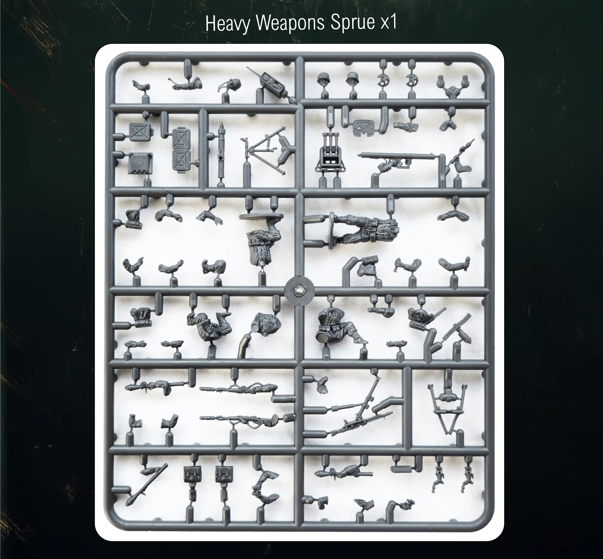 This bag of minis comes with 44 miniatures, with all kinds of weapon options to be expected in a modular infantry platoon. This includes medium machine guns, medium mortars, Panzerschrecks, Panzerfäuste, Radios, medical equipment and AT rifles. To avoid the duplicate look, every sculpts has one or more alternate build options. There is some inconsistency between certain sculpts, with the majority having a plastic putty base and some having none. In particular, the crew of the Machine gun and all of the prone bodies do not have a putty bases. As with every Victrix set, this box does not come with bases, so you will have to source your own, I bought two bags of the renedra cobblestone bases for this set specifically. Now as I mentioned before this set doesn’t only have your typical squad weapons like LMGs, Panzerfäuste and the occasional officer head, on an extra sprue you have all the extra pieces to make this an effective fighting force out of the box(or well bag). There are the crew and parts for the two medium weapon teams, a Panzerschreck, a radio for forward observers and AT rifles.