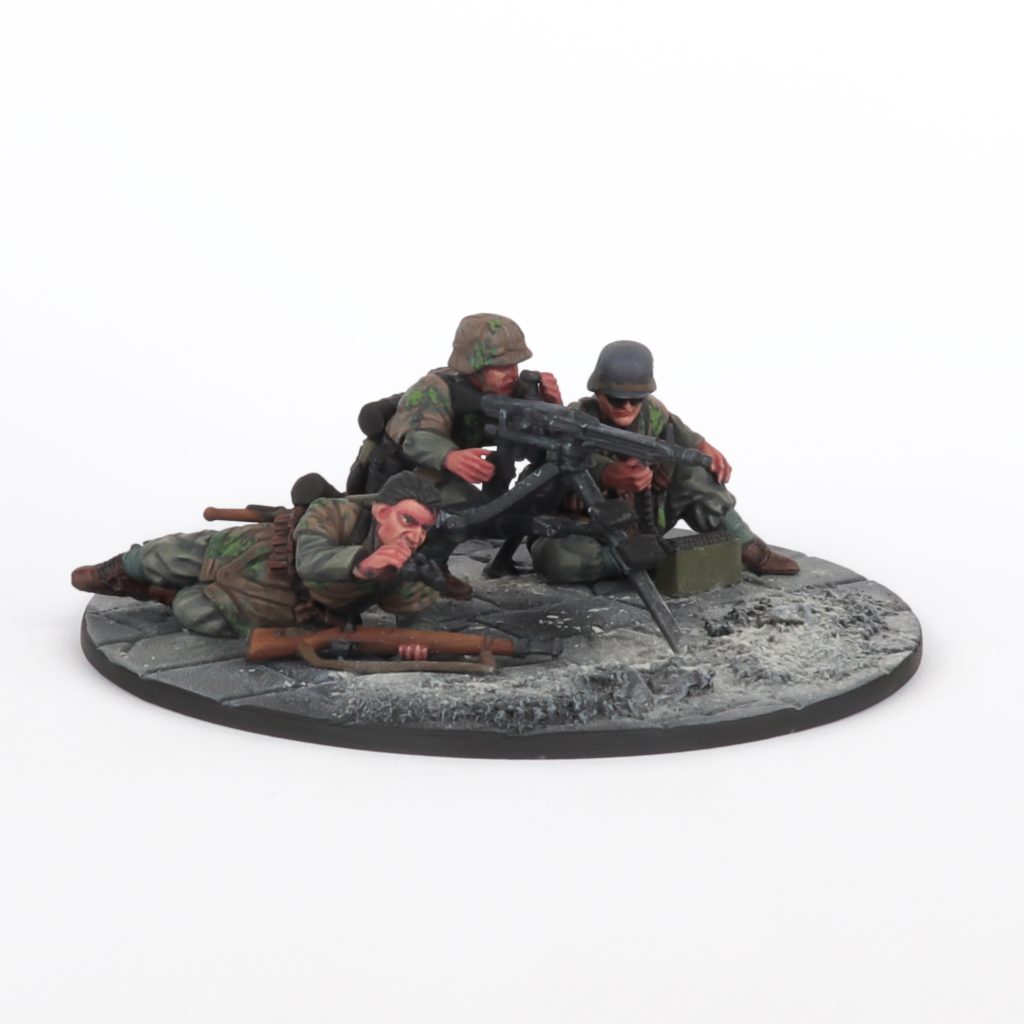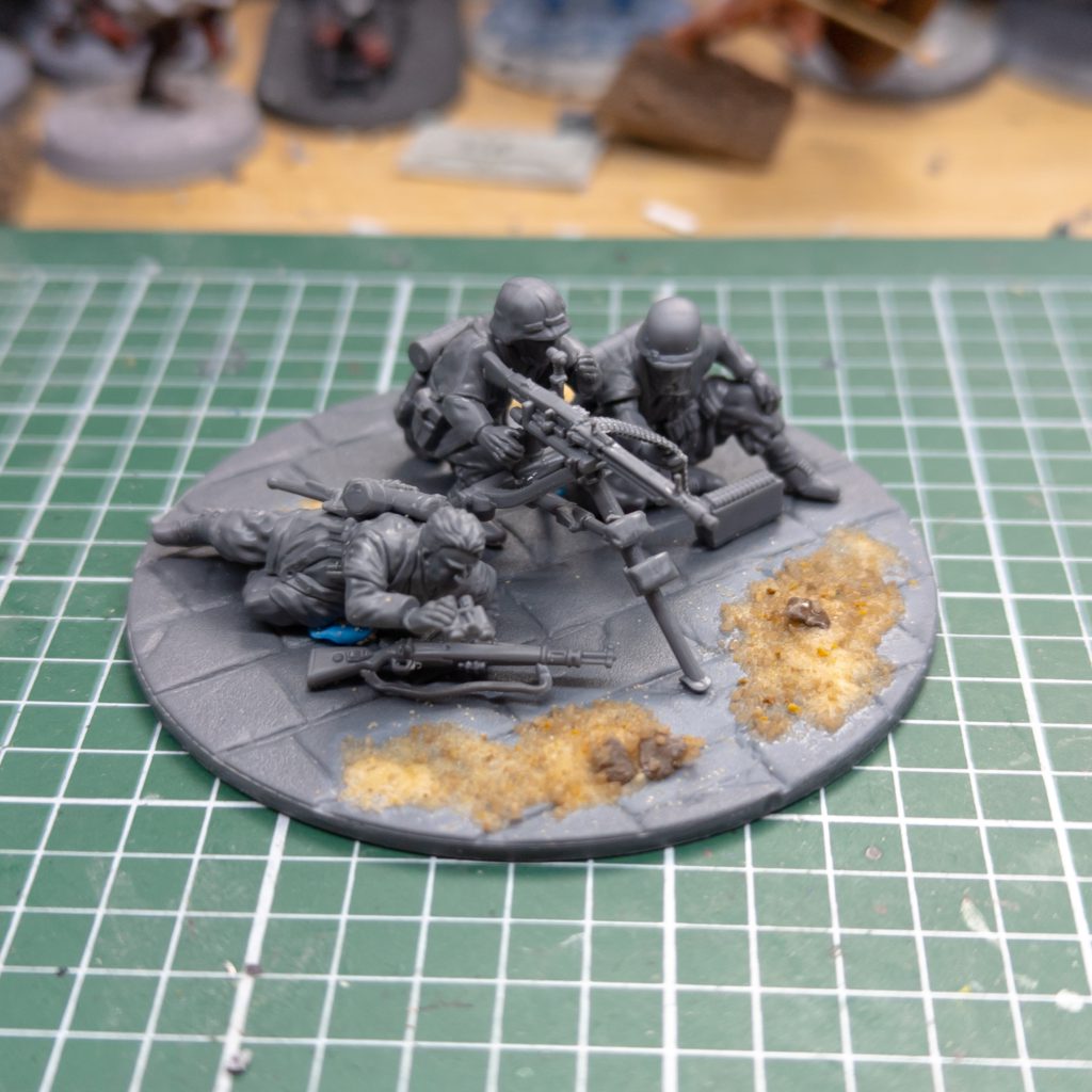 Now all that sounds amazing on paper, but one glaring issue that comes from this attempt to adapt very statuesque look is a lack of customizability. While they offer plenty variation for most sculpts that do not wear Zeltbahn, all who do have most of their body pre-sculpted, with only the forearms being separate pieces. This severely limits the articulation of arms and locks you into poses more so than the bodies that don’t wear the ponchos. While not a death sentence, the historical wargaming hobby lives from kitbashing. Nothing in history was ever truly as uniform as some fascists would like you to believe. The lack of customizability is palpable and I think if you plan to build bigger platoons, you might get a little sick of how few choices beyond a head swap you have with these. Obviously people who have a lot of metal miniatures will not bat an eye since repeated poses are just a given, but this kit is plastic, a medium that allows for options and customization. Speaking of plastic miniatures; Another issue is the insistence on putty bases. I understand why they are convenient on metal miniatures; they create a bigger contact point for gluing (which is especially useful on running poses) and are useful for the casting process. But what purpose do they function on a plastic model? I know its not super hard to remove them, but I wonder why they were left out on the prone models and the MMG team? It just feels weirdly inconsistent and they could have just done away with them entirely in my opinion.