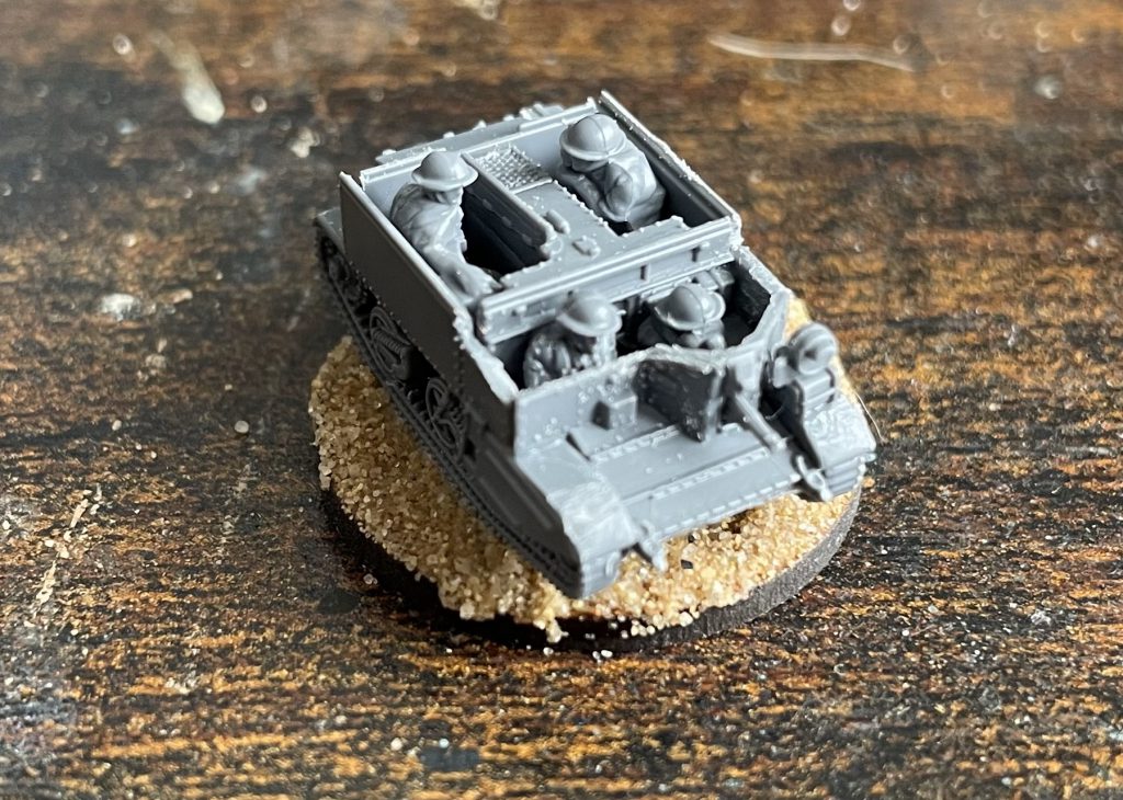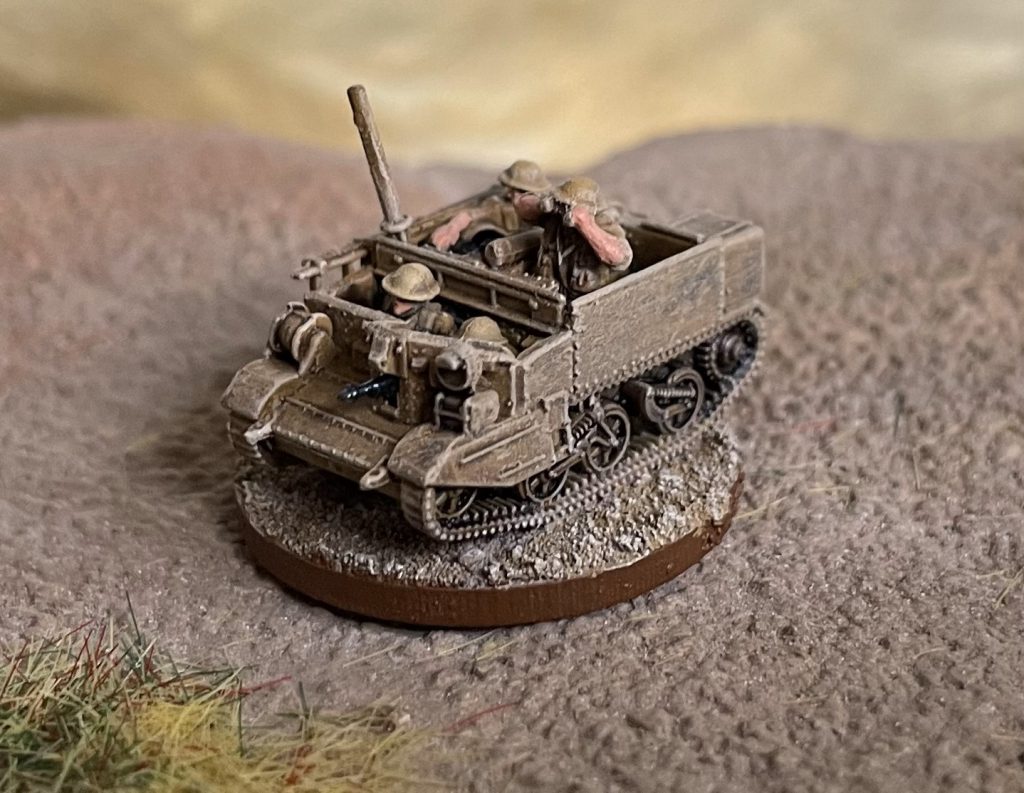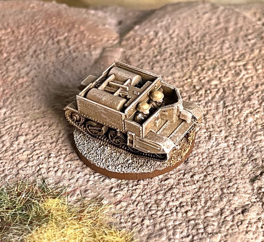 This means you can buy a bag and put together a Carrier Section (two, and three in the late war, bags would get you an entire Carrier Platoon) accurately according to any TOE you can find online. You can fit the full complement of crew/passengers in each Carrier, and if you wanted to be incredibly clever you could leave crew unglued, letting you switch from early war 3 man to late war, 4 man, teams. Of course, in researching this, I found about fifty variants of the Carrier Platoon/Section, but most of them stabilise around three carriers – one transport, one 2 inch Mortar and one anti-tank. I built mine to this, added a command tank and couldn’t resist adding a flamethrower carrier.