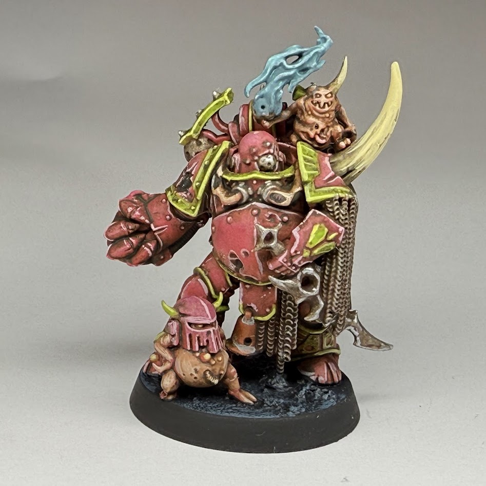 First of all, I finished a test model for a Death Guard army. I’ve always wanted to do some in a bright pink and green scheme, but was at a bit of a loss for how to do it efficiently. My solution is to base with Convict Orange spray from Colour Forge, before a zenithal of Rogue Pink. This spray can solution does a lot of the work. From there it’s some basecoats on the trim and other bits, gloss varnish, streaking grime, matt varnish, and honestly that’s mostly it. I’ve done some highlights for the extra pop.