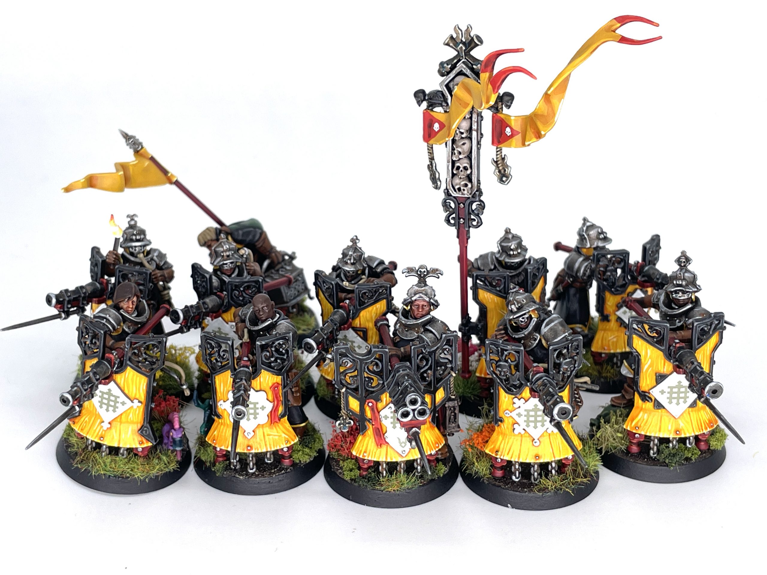Despite being part of the initial coverage of the Cities of Sigmar range, I never got to actually paint up any Freeguild Fusiliers, their line shooting infantry. Good gravy, were they a lot. Like, a lot a lot. I started them a month and a half ago, and while I definitely got pulled towards other projects, each dude was like painting two models for the price of one. Those pavises take a boatload of work, and the infantry are no slouches either. I’m super happy with how they look, but they are one of the few models I’ve encountered as an adult where I can say they’re actively difficult to paint. Know this, dear reader: anyone advocating you paint 60 of these is advocating self harm.
