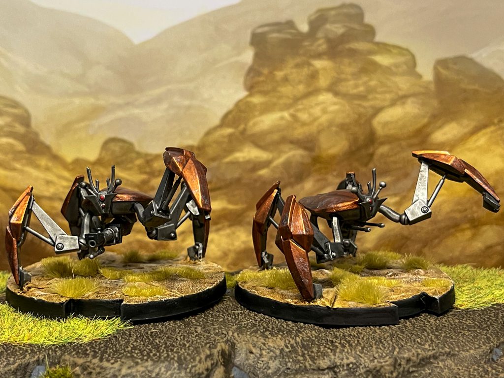 Anyone familiar with droid kits knows that they take about twice as long to build than they do to paint and that is absolutely still true of both of these. I really need to get a desert hill for some more fitting photos. The Crab Droids especially I kept staring at reference pics thinking that there must be more detail to add and there just….isn’t. They’re simple. I love that. I went for a metallic finish though instead of the weird matte orange one on the box art, it felt more correct and that copper with a shade is just gorgeous. Battle damage was a necessity. The Aqua Droids are equally simple being just a few silvers, a Darkstar metallic blue, and a dark grey for joins and guns before a nice thick wash is slapped all over.
