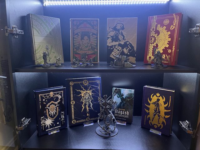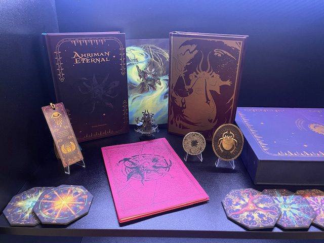 Here’s a closer look at the Ahriman shelf, including the coins, tarot cards, and bookmark from the Ahriman: Eternal Limited Edition box.