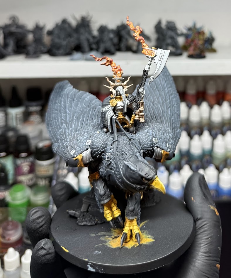 I’ve nearly entirely switched to Pro Acryl for my paints and the coat leather was a good way to finally utilise all the warm-browns I’ve collected. It’s a simple effect of scratchy, layered highlights moving into ochre and then glazed back down with a red-brown. (in my case, Reikland Fleshshade for it’s semi-gloss finish to contrast against Pro Acryls matte finish) It immediately pops and looks great on the table, which is exactly where he was next day leading me to a decisive victory against some Custodes.