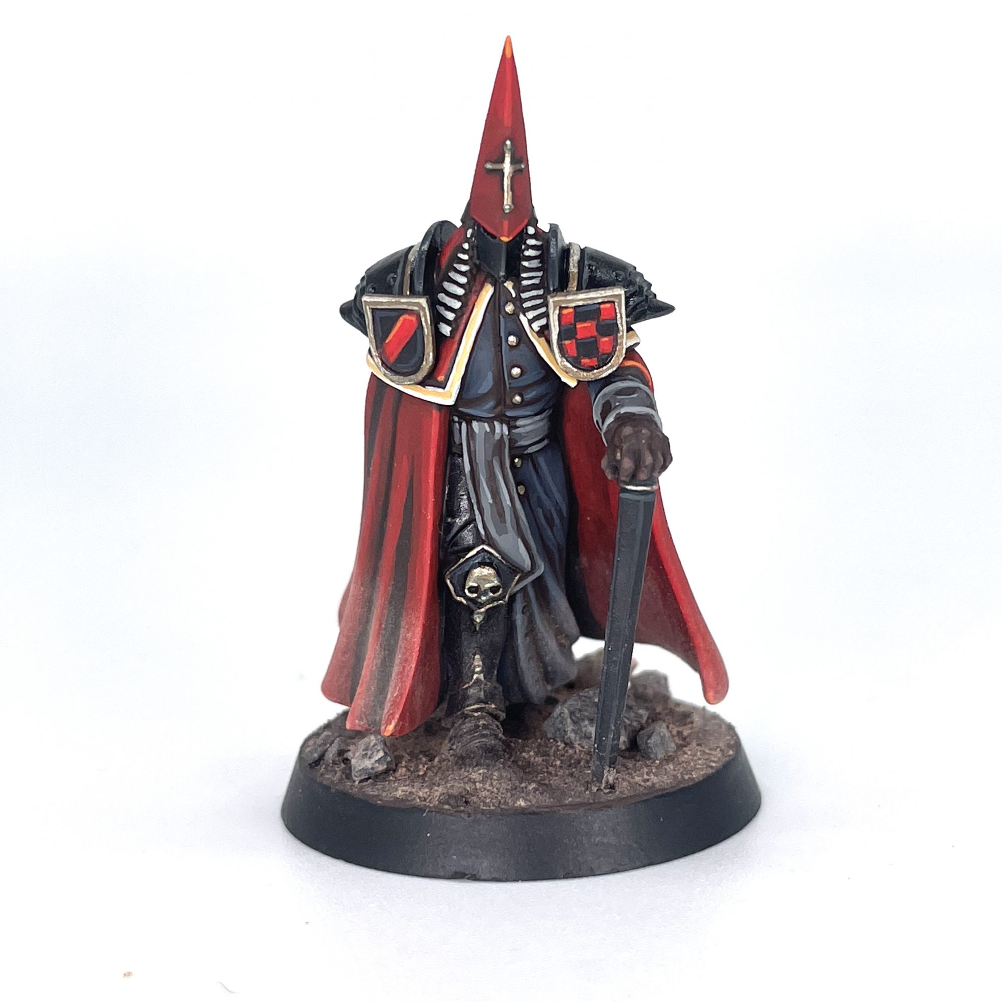 If the Observer is the most Necromunda-coded of the bunch, the Witchburner General is the most 40k Inquisition-coded of them. Obviously they’re drawing from the same exaggerated Catholic imagery, and I leaned into that hard by referencing cardinal robes and priest vestments. This much cloth was just easy and fun to paint. I tried going for a glossy finish on his armor to sell his status as Da Pope’s #1 Fanciest Boy and I think it came off reasonably well.