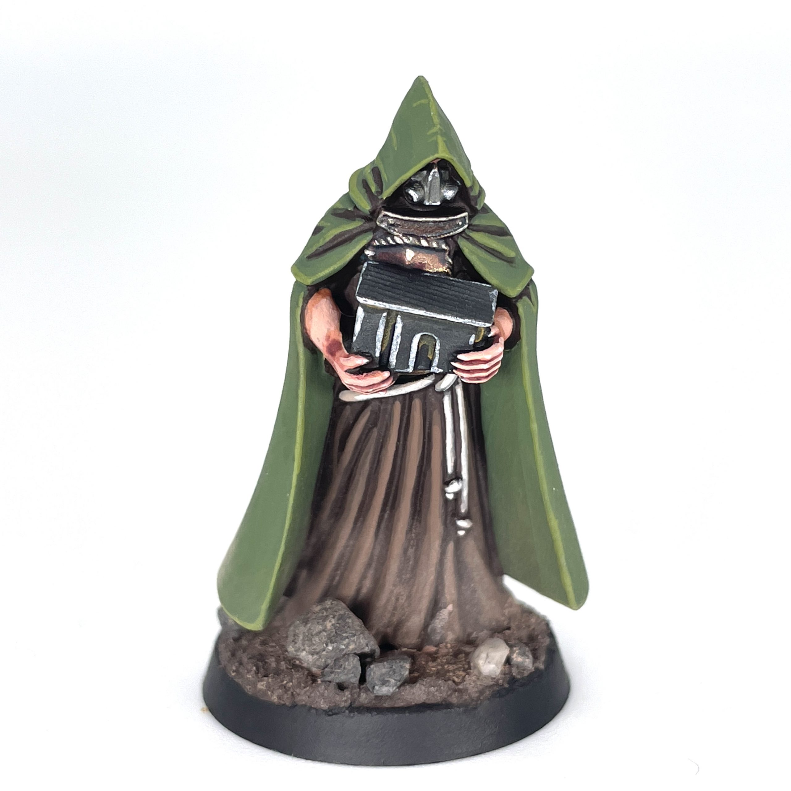 After painting that crew, I still had some colors left on my palette, and painted up the Mendelist Ammo Monk to go with them. I painted his robes to be a pretty typical for a friar, but had the notion that these guys would see ammo cans as sacred objects and their holy color would be olive drab as a result. Of the bunch I think this one is maybe too simple – some holes in the cloak or other detailing would have been nice – but he painted up quick.