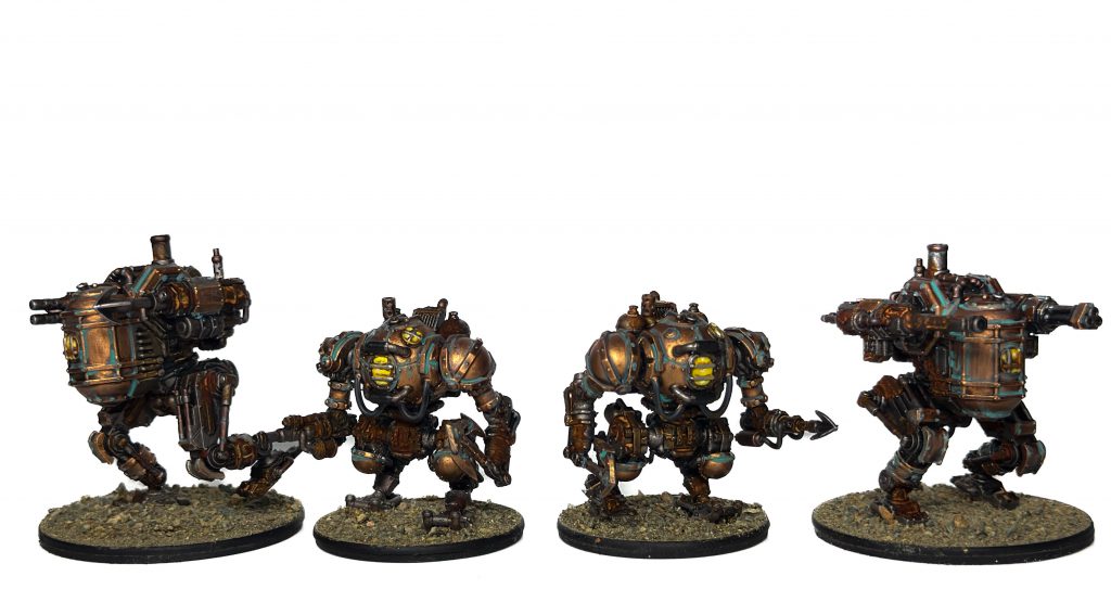 In a very, very, different aesthetic I was targeted for an advertisement on social media for a “dieselcore” mech game. We’ve also reviewed that and is also very cool. Snafu printed some rigs for me and got to a handful of them so far with another small group ready for sponging. These are small, about Space Marine Terminator sized, and were a lot of fun to go heavier on with verdigris and rust after painting a lot of cleaner models the last couple of months; can’t wait to get to the larger ones!