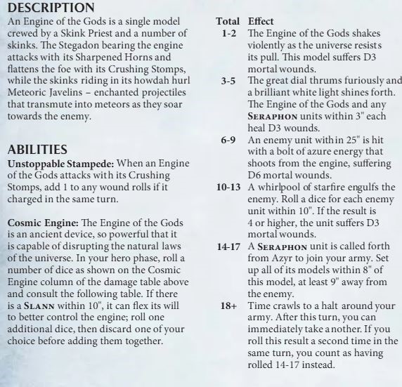 What really sticks in my mind for AoS’ truly maddest rule moments is the original Engine of the Gods. In your hero phase it got to roll 3 dice at top bracket (with a Slann nearby giving you 4-dice-drop-1) and gave an effect based on what you rolled. With the 18 result straight up being you get to take another turn immediately after finishing the turn you were in. Combined with the prio roll, it was possible (but pretty statistically unlikely) for Seraphon players to get a triple turn on their opponents.