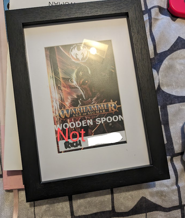 This story also has a delightful coda: although Cronch beat me fairly handily, the scores were transcribed wrong by the TO and by the time they had corrected the mistake they’d already written the trophies and put his name on them. So not only did I lose all my games, but I even managed to lose the wooden spoon.
