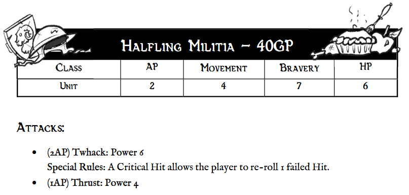 One thing that I really like is that it’s open to interpretation what the weapon is with no important differentiation between slings, bows, or crossbows. Or anything else you could imagine, maybe your halfling loves throwing pies or sandwiches or something else! It’s all the same. Since no feat type is stated it just needs an easy feat to use. If our Halfling Militia model above was firing it then you could choose to use one Action Point at a time to attempt to fire it twice, and if you get lucky do some serious damage at range! Some weapons don’t allow you to use them more than once per turn, in which case you’ll want to use more Action Points to help guarantee that attack hits home.