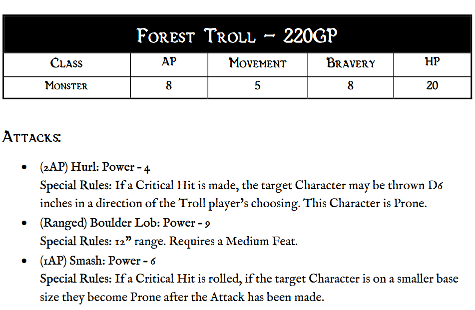 This big guy is going to cost you 220 gold pieces, a fair bit more expensive than our Halfling above, but with four times the action points to use, a bit faster movement (and on a bigger base that goes further, too) as well as higher bravery and more than three times the number of hit points. Definitely going to be a bit harder to take down! We’ll get to what a Medium Feat is below for a ranged attack. You might have noticed that those melee attacks are the same exact power as the Halfling, which makes sense since the Troll can use them many more times in a turn, but will also notice that the Critical effeects will knock characters on smaller bases prone or even hurl them away!