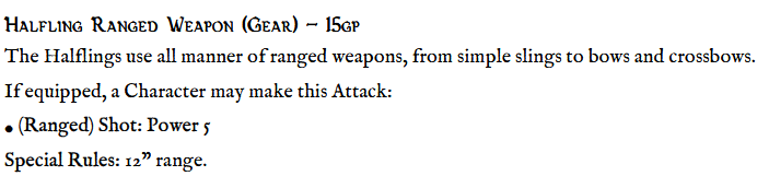 Shooting is done with the feat system, most often needing an easy feat to succeed and once you have succeeded then you get to roll the weapon’s power for attacks. Every faction has their own version of a ranged weapon that models can purchase and will differ slightly as is appropriate for the faction. Let’s look at the Halfling Ranged Weapon: