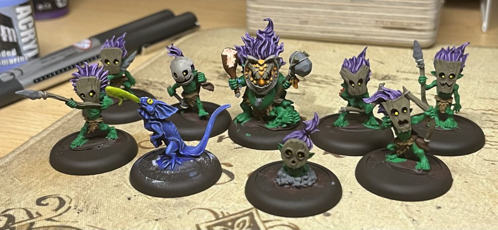 My approach to painting miniatures is typically on the side of “get them done to play with” so keeps it very simple. When it comes to a whole army or warband that’s only nine models it’s a lot easier to spend just a bit more time on each while keeping them simple. These sculpts are incredibly rewarding to paint with wonderful, deep, detail on each one making the wood grain nice and easy on all weapons and face masks and the skin very easy to throw a shade and simple highlight on to look great.