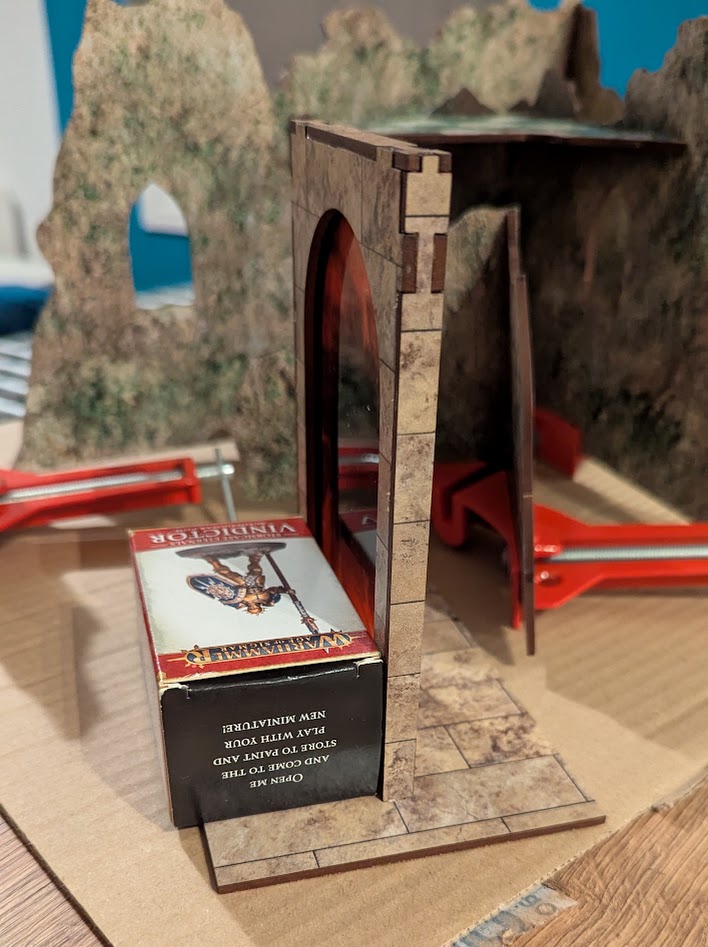 The portals were a little bit more involved. They consist of two face pieces and three long pieces that frame the edge, and this whole assembly then slots into a base piece. After a couple of failed attempts, my method was as follows: first use a few dots of glue to tack the coloured film in place on the inside of one of the faces. Take the other face and glue on the top frame, then the two side pieces. Attach the first face piece onto this assembly, then finally slot the whole thing into the base, gluing the joins first. I found that the pieces didn’t locate firmly into the base, leaving my portal on a bit of a slant. My clamps wouldn’t fit here, so I dug out the aforementioned square-cornered object (a GW Miniature of the Month box, in my case) to prop the portal up while it dried.