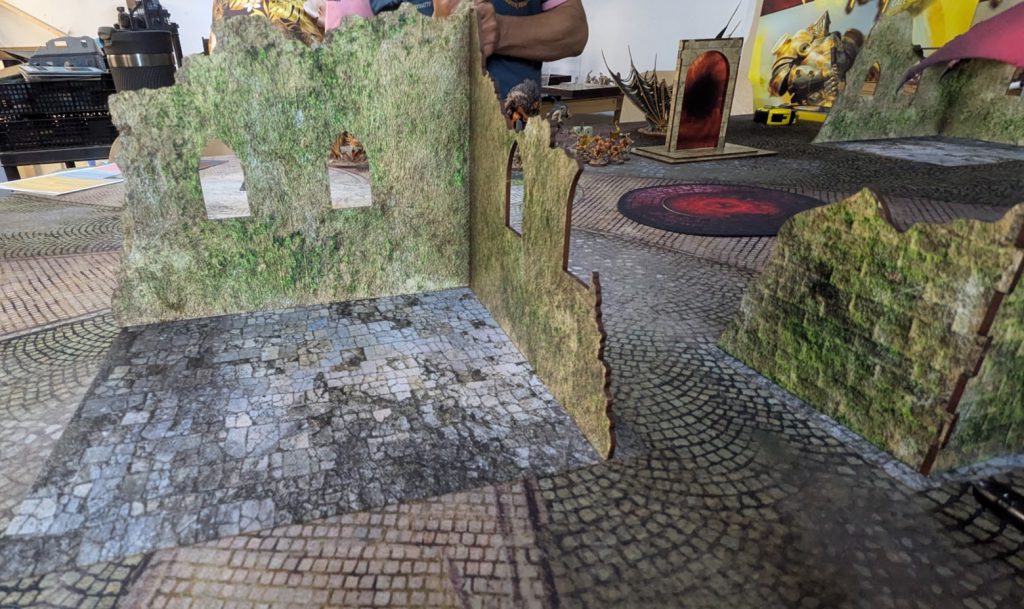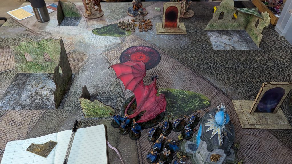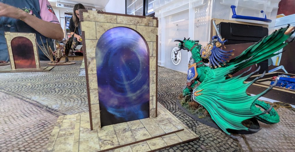 For me, I’m a big fan of the terrain set and really enjoyed the games I’ve played on it at the event and since. I feel that the fabric bases cover roughly the right amount of the table, the ruins really clearly block some lines of sight, and the arcane portals really stand out as Places of Power, but are also sized correctly to use as obstacles if a battleplan’s terrain map calls for it.