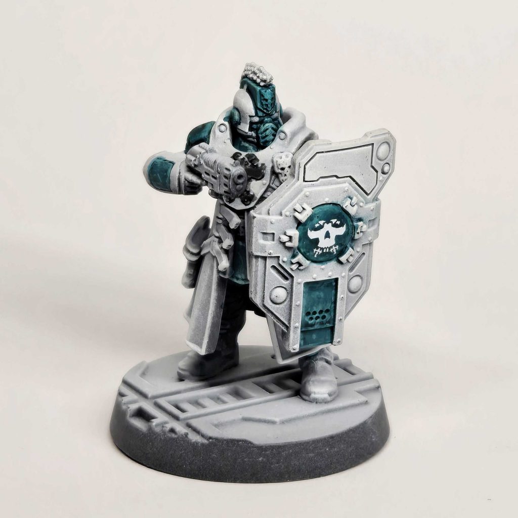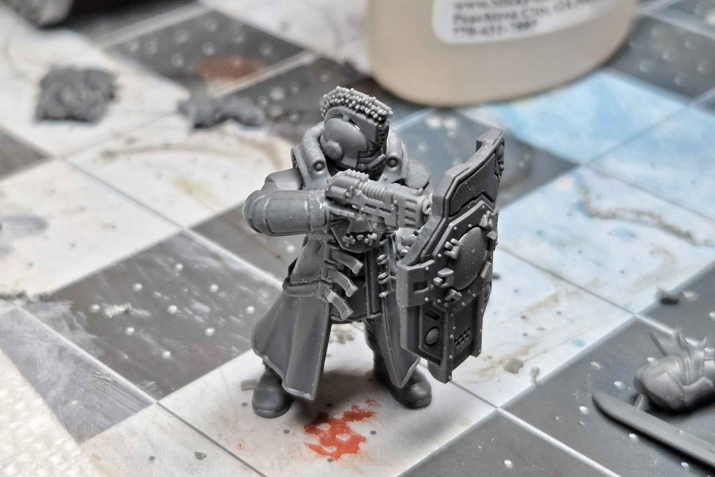Captains only have a few options available in the kit: pistols (bolt or plasma), along with an unarmed left hand or two different power sword variants. My dream was to have a plasma pistol and riot shield captain – using options in the upgrade sprue and a pistol from the Captain box. The lack of molded shoulder pads on outside arms presented a serious problem – how do I make other options look good?