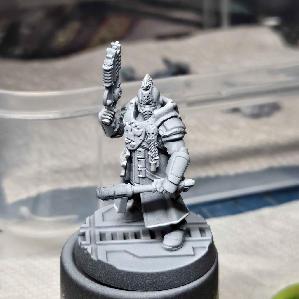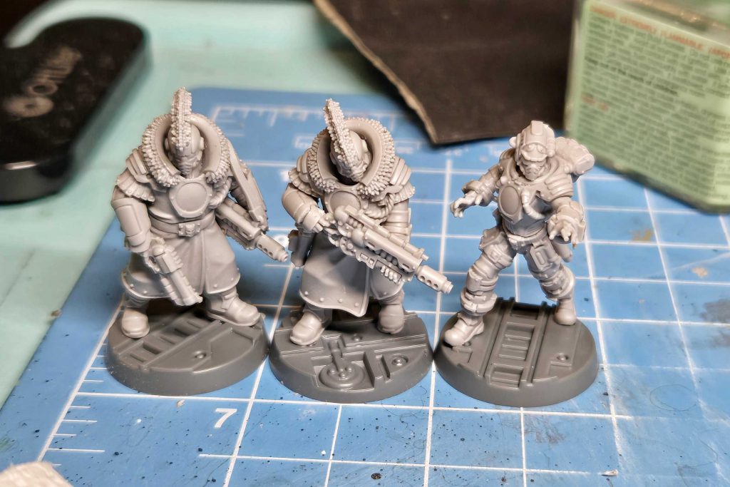 I’ve been looking forward to the Palanite Companions kit for a long time. A pair of badasses with dusters and horrifying guns. The builds were pretty straightforward. One pitfall here – the Companion with the gun across his chest will get in the way if you are trying to do a transfer there. I would recommend leaving that bit off if you plan to freehand or apply a decal. I am in the early stages of painting these, but fair warning that there are a lot of details in close proximity around the head / neck / cuff / etc. Even when I was going slow and being careful, I got a fair amount of paint in the wrong spots. Take your time!