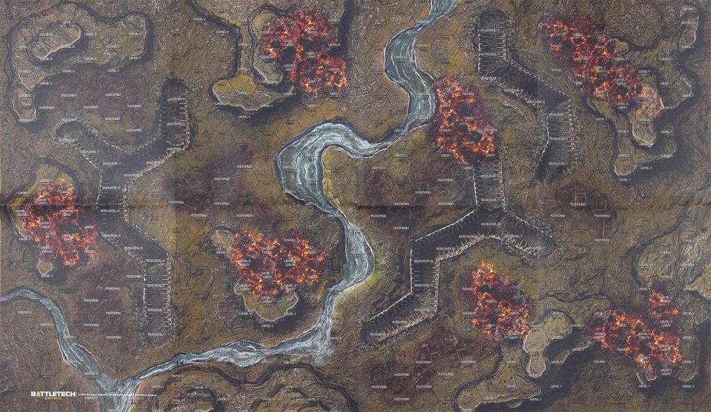 The game map is the standard BattleTech size and looks fantastic. On one side you’ve got a beat up battlefield, covered in mech-sized trenches, burning forests, and has a river crossing the middle. It works well for the BattleTech Gothic games (or other BattleTech games set in the Succession Wars era), but is a little limited in later era games with longer ranged weapons – it doesn’t have a lot of elevation, so has a lot of open sight lines. BattleTech Gothic is mostly short ranged, so it’s not an issue for playing out of the box.