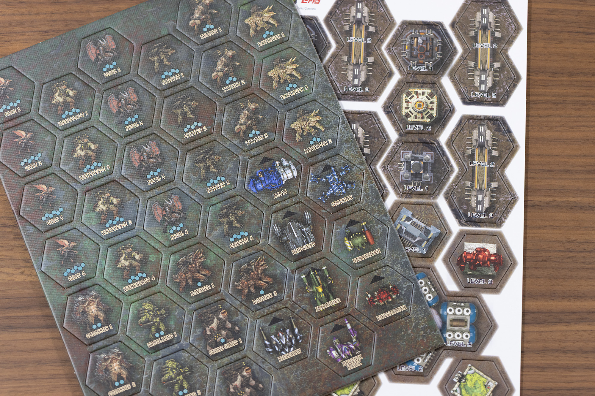 One of the punchboard sheets has all the abominations, with between two and four of each, depending on how big they are (you won’t be using as many of the big ones in games as you will the small ones). Helpfully, they’re all numbered, so it’s easy to keep track of damage on each one as you play. The back side of the abominations are unlabeled, which gets used in an Abomination Unknown set of optional rules, where you know there’s an abomination but not which one it is. There’s also a full set of ‘mechs, which is needed as some of the scenarios in the book use more than one of each ‘mech. The back side of these tokens are also ‘mechs, in a different arrangement (so you don’t have an Atlas on both sides of the same token).