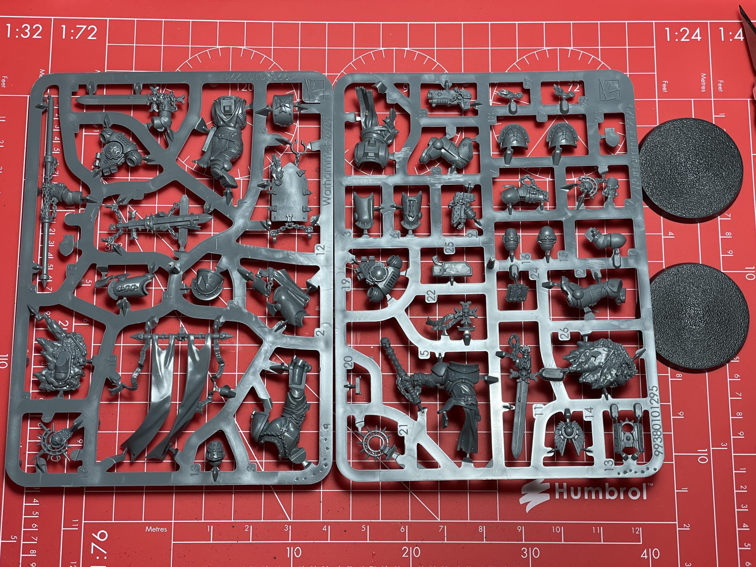 The sprue is fortunately small enough that the layout doesn’t much matter – all the pieces are immediately visible and identifiable. The only included option is the banner topper, either going for a hanging shield or an Ork skull/sword combo, but whichever bit you don’t use can be stuck on the side of a tank or Dreadnought for some great Templar flair. You could potentially leave these off for painting – as I very much should have done – but they fit without any issue. You could also leave the tilting plate off if you’re a coward who doesn’t enjoy heraldry, in which case, what are you even doing painting Black Templars? His head and backpack have the same standard fittings you’d find on any Marine model, and you could swap his sword arm with a bit of cutting. As-is, it’s got a strange angled join that doesn’t have the best fit. The actual construction of the model has some slices the likes of which I haven’t seen in a while – those weird joins where disparate pieces connect in unexpected ways. For instance, the hero rock he’s standing on is connected to one foot, and somehow connects to his other ankle. His left greave also has the butt of his bolt pistol, and the banner also attaches to his pauldron. This makes for a somewhat fiddly assembly process, but it does reinforce the model, which I appreciate. To further stabilize mine, I added one of the leftover hero rocks from the Drop Pod kit to the bottom of the banner. Altogether, he took about half an hour to build, with some mold lines that needed a bit of work to trim.