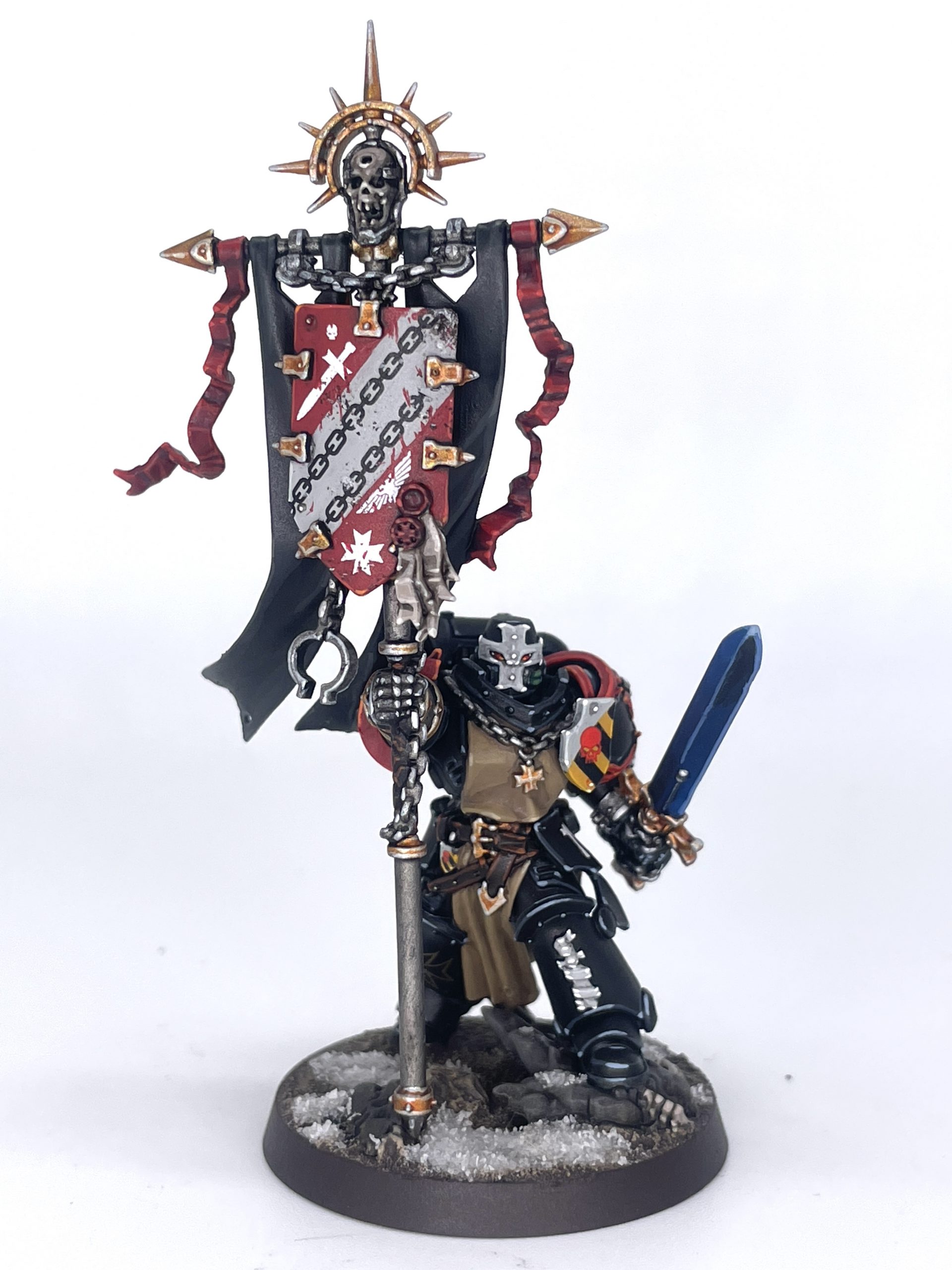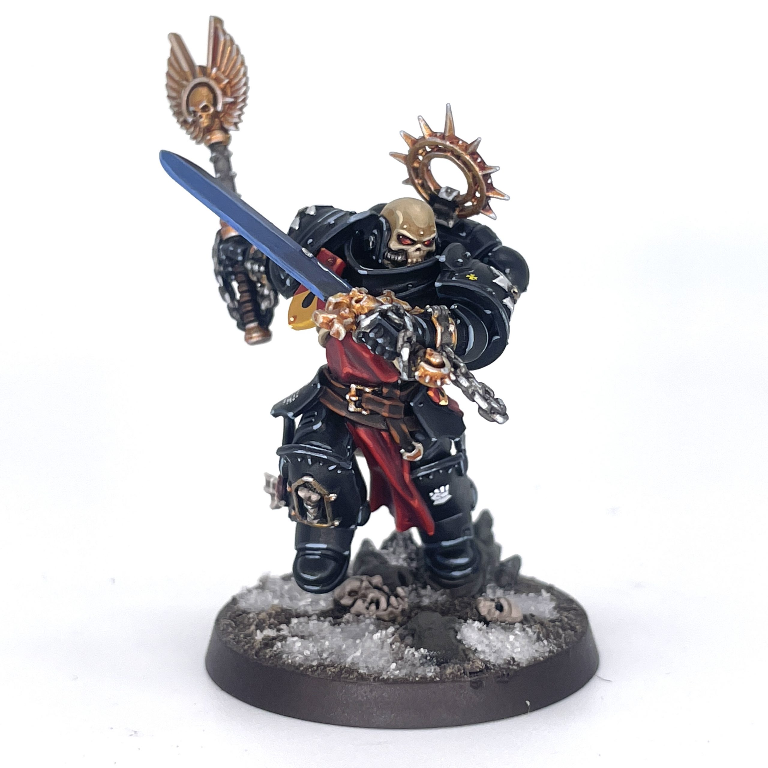 Painting the Execrator is a smidge tricky, at least if he has his power sword option. It’s across his body, so you’re constantly trying to work around it, and for that reason I saved painting it for extremely late in the process. It made getting to his tilting plate a challenge, doubly so since I’d chosen bright colors and transfers to work with. I’d also recommend leaving his head off and painting it separately, as his high gorget and the high contrast of bone against black means it’ll be easier to work with if painted as a subassembly. Otherwise I found his details and pose all really easy to work with. There aren’t altogether too many doodads on him, especially compared to somebody like Grimaldus, and most of the detail work is just highlighting straps.