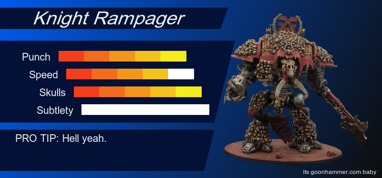 On the upside, I like the new Rampager, and the Abominant is decent with the +3 shots on its Volkite Combuster. When viewed in the context of some strong detachments, there is real play in most of the big Knights now.