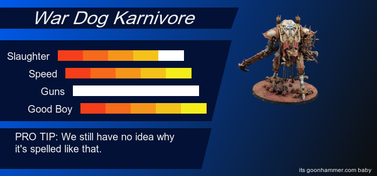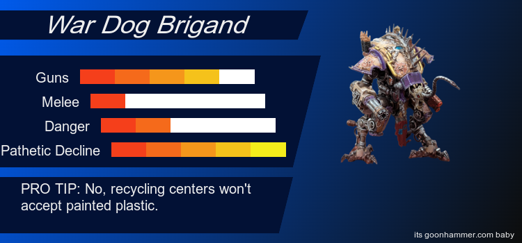Where the Ruinator has some silver lining though is his abilities. Methodical Destruction has you pick something in your opponent’s army at the beginning of the battle and he gets reroll wounds against it until it’s destroyed, at which point you pick a new target for the ability. This is nifty for helping or anemic ranged weapons punch up, but doesn’t really help the melee situation unless you target an infantry unit you were planning on sweeping with it. The star of the show here though is Close-range Killers which gives all War Dogs within 9” extra AP if it targets the closest enemy unit. This even includes melee, meaning you can finally have those AP 4 Slaughter Claws. If he gets cheap enough, I could see folks taking this for just his buff. Some of you may be asking “But wait, isn’t that the rule the Brigand already has”? Well…