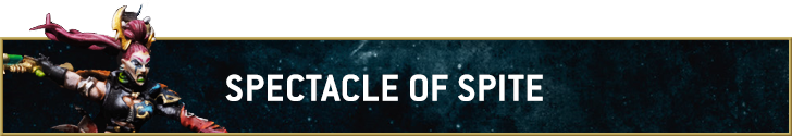 Spectacle of Spite is your Wych-focused Detachment, giving you the choice of one of six Combat Drugs to be active for your WYCH CULT units at the start of each Command phase. Or you can pick two at random, with no benefit for rolling doubles. You can only pick each effect once, but you can randomly generate an effect a second time. These effects improve your army’s characteristics in similar fashion to a Creations of Bile list (a nice little lore throwback to his time training with Drukhari).