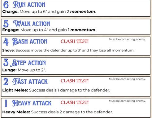 Moving is otherwise very simple and very free. The only thing you can’t do, really, is move across other models bases. Being base to base with enemies doesn’t hamper or slow movement in any way either, you can simply walk away from combat. Bashing an enemy lets you move the enemy model which is very powerful in any game and here it happens after all of the faster paced, momentum-giving, movement occurs leaving your opponent with a model out of position and without momentum for any ensuing fights; it does require a successful Clash test to happen, though, which I’ll be covering in the next section.