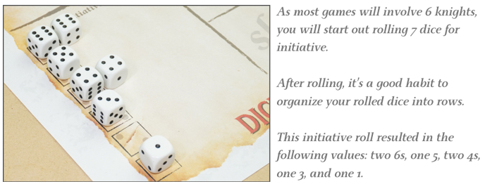After all of the initiative step dice are fully used up it’s time to see just how courageous your knights are still feeling. Whichever player has sustained the most damage on their knights across the game so far starts testing for their courage first, or the player with fewer models remaining if damage points is tied. Any knight that has sustained any damage and is in base contact with an enemy has to test their courage; you may simply choose to fail if you wish too. To test courage there’s a lot of math involved but the short of it is that the more damage sustained and the more enemies around the harder the test will be to pass; a roll of a 6 however will always succeed, so just roll 6’s and you’re all set! If you do somehow fail to pass or simply roll a 6 then your knight testing is removed from play as a coward.