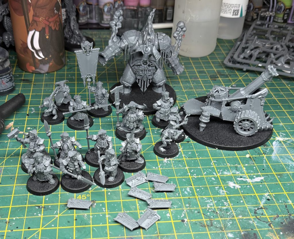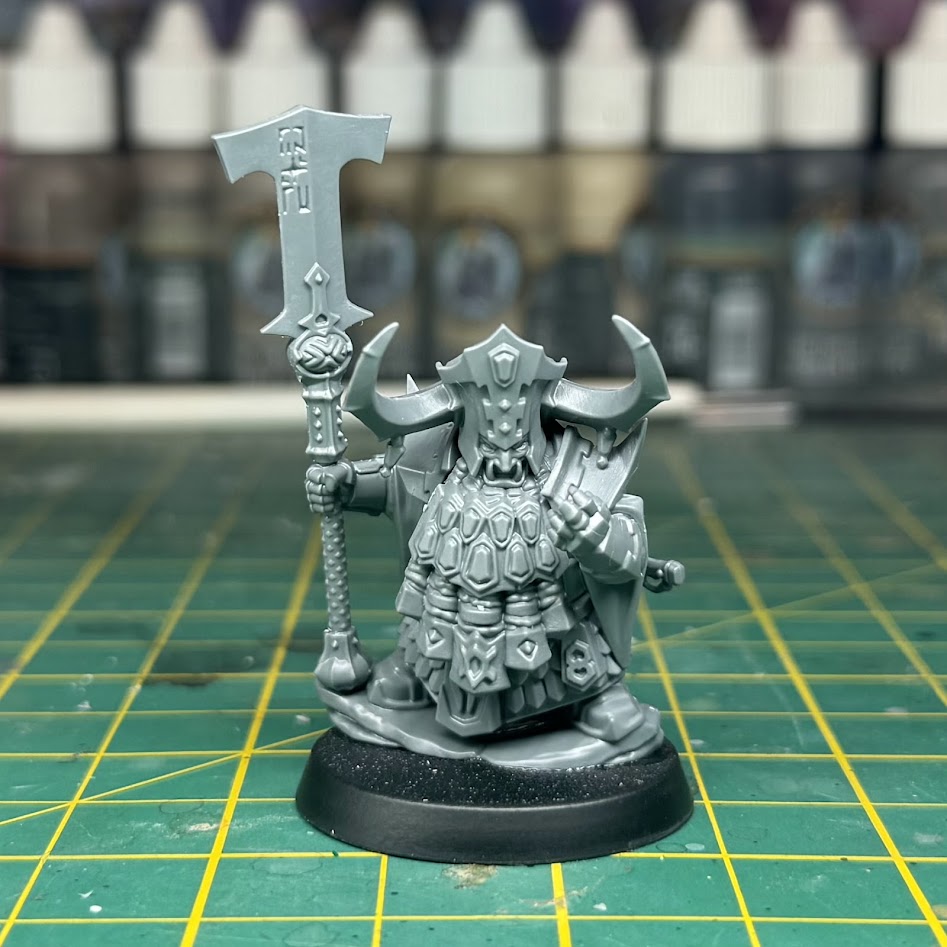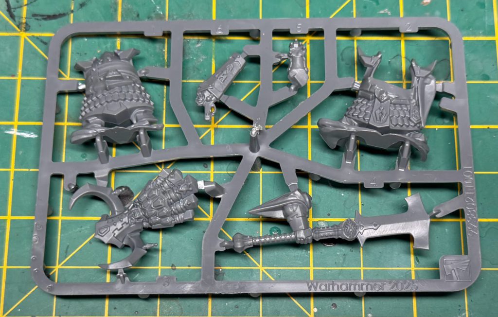 Rich: The Despot comes on a tiny frame in only six pieces, but despite the surprisingly svelte sprue he assembles up into by far the chunkiest of the Duardin in this set. He goes together well, and although you could easily leave his arms/hands off for ease of painting in subassemblies, I found there was no need to as the pose is nice and open. There’s not a lot else to say really, easy to build and a great pose! The downside, he’s very static and there are no options, so I can see people trying to get hold of the upcoming Underworlds kit or the alternate build from the mounted version if they want to run a second War Despot without them being identical.
