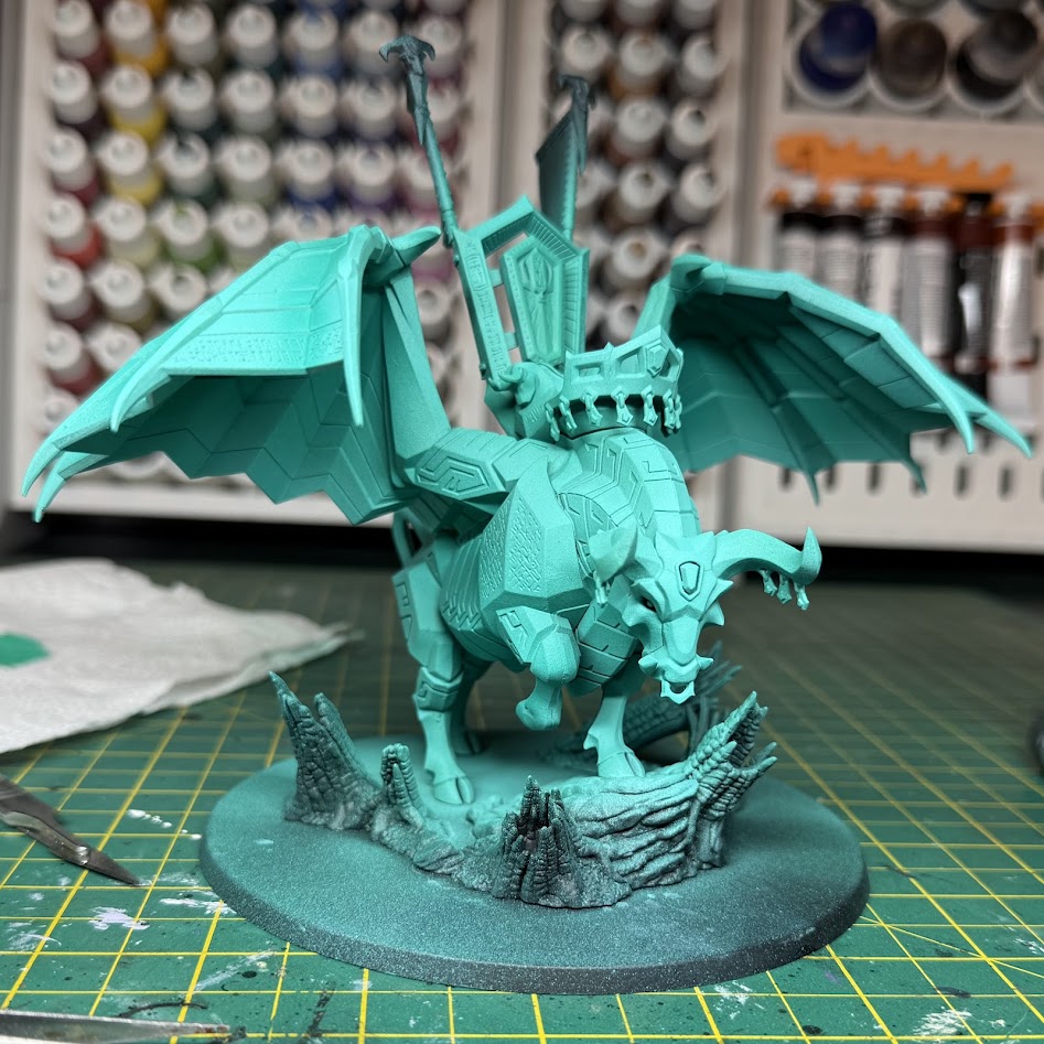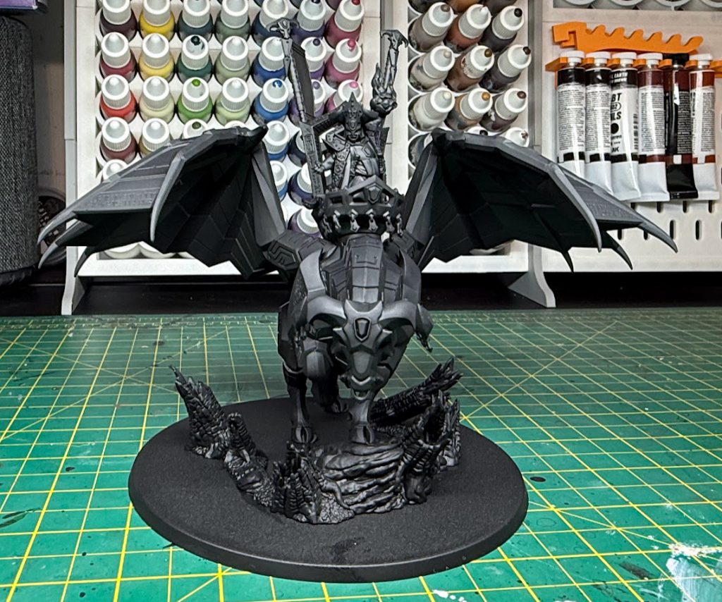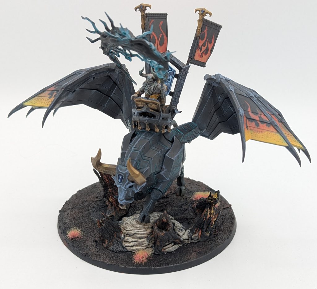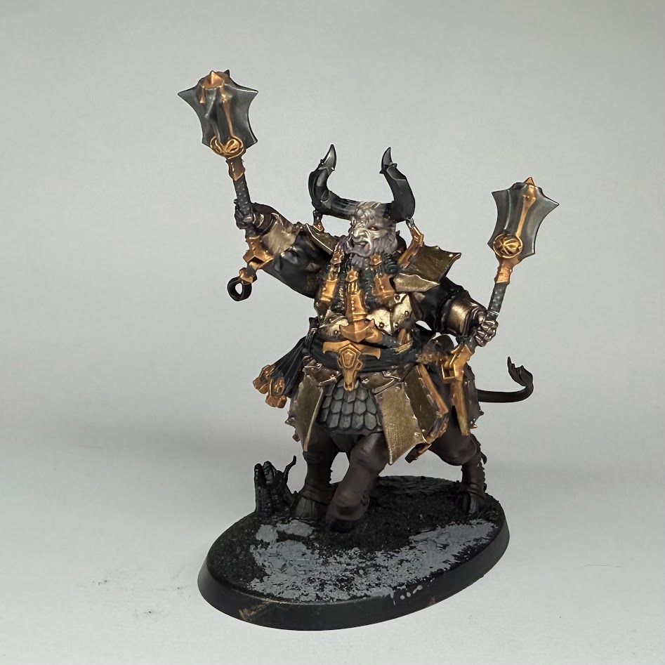 Unfortunately, the Taurus caused me a lot of problems, meaning that the noble Daemonsmith remains unmounted for now. Broadly, I’m happy with the scheme, and think this ultimately looks alright for the tabletop, but I had a lot of problems with texture buildup and failed attempts to save it which has led me to decide that I’m going to strip it and try again. This wasn’t possible in the time available before the preorder though, so please enjoy the half-finished picture for an idea of how the beast will look when it’s finished! This model is super heavy on both hard edges and recesses, so be prepared for it to take a lot of time to paint neatly.