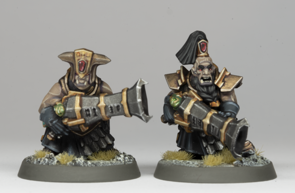 I had a lot of fun painting these, and it was a fun challenge to make them match the rest of the Helsmiths units whilst giving them a bit of identity of their own too. In the end, I settled on the same dirty orange robes as I’d used for the Hobgrot crewman on my artillery piece, and added a lot of weathering to the armour and weapons. The Helsmiths themselves are almost completely clean, other than the occasional scratch on their armour/weapon, so leaning into the rust here let me keep the themes distinct. I also chose to use the dark bronze colour for weapon hafts and decoration here, with the idea that perhaps what the Helsmiths deem as the minimum acceptable material for their armour is something both extremely valuable and relatively inaccessible to the Hobgrots.