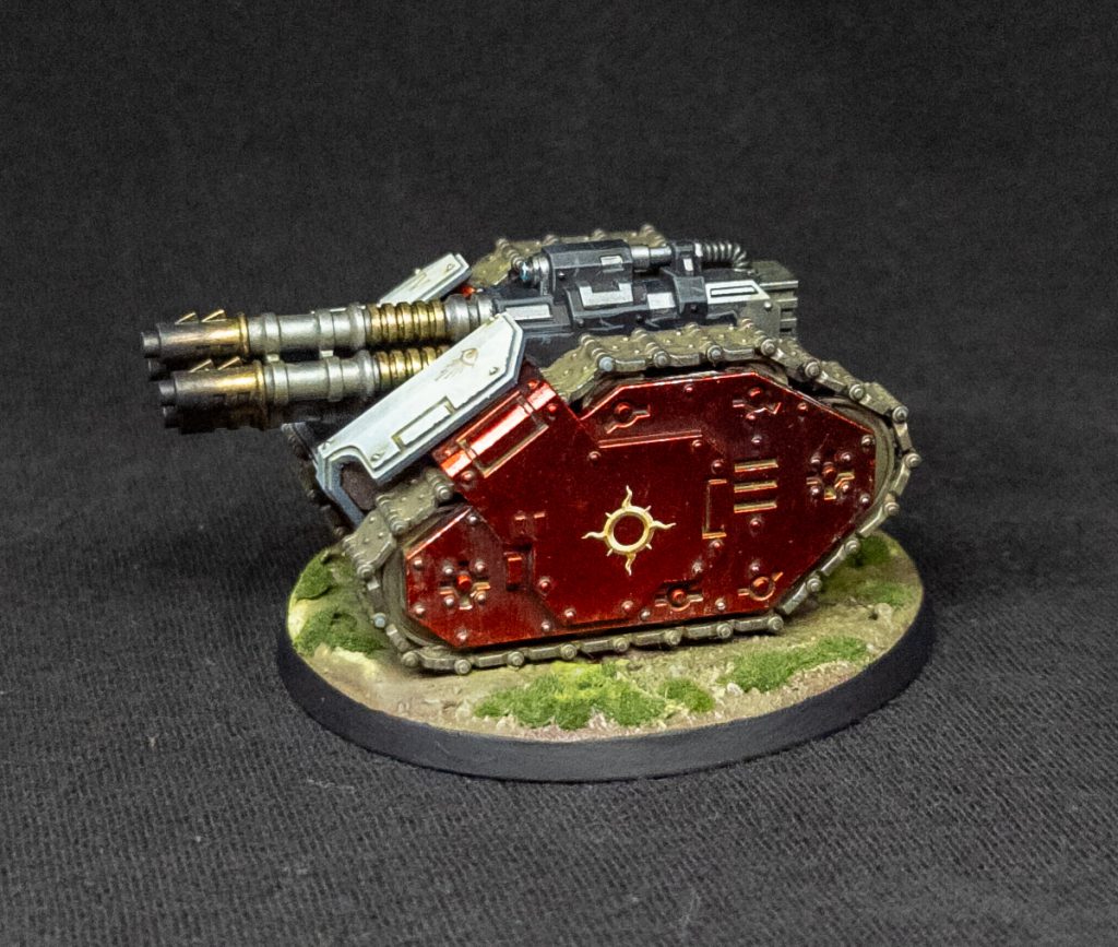 meltabombed: The only real “subassembly” I did on this kit was to leave the treads off until I was done painting the main chassis, just to avoid having to dig my brush around underneath them and risk getting black or silver paint on my nice clean candy red paint. Otherwise, painting was straight forward as one of the first few models for this new army for the new edition. The big flat panels on the Rapier itself lent themselves well to decals and streaking, chipping, and weathering. It was all the fun of painting a tank at 1/4 the size.