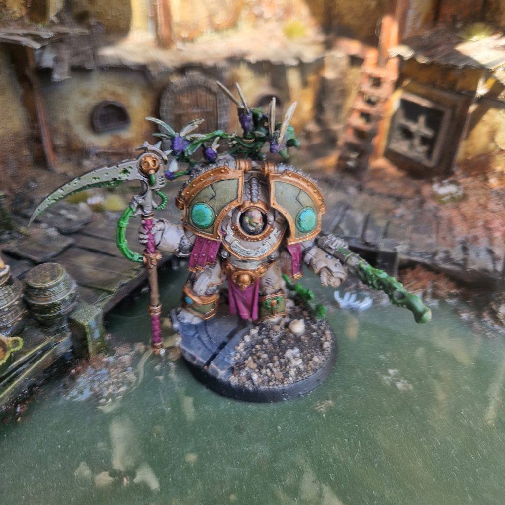 For my model, I knew I wanted a scythe and a bare head, and sourced these from the Deathshroud and Primaris Hellblaster kits respectively. This man is an obvious Traitor, so I added some BEEEESSSS from 40k Typhus, a bit of smoke from the Freeguild Command Corps, and made his blaster shoot GUCK with a bit from the Orghott Demonspew box.