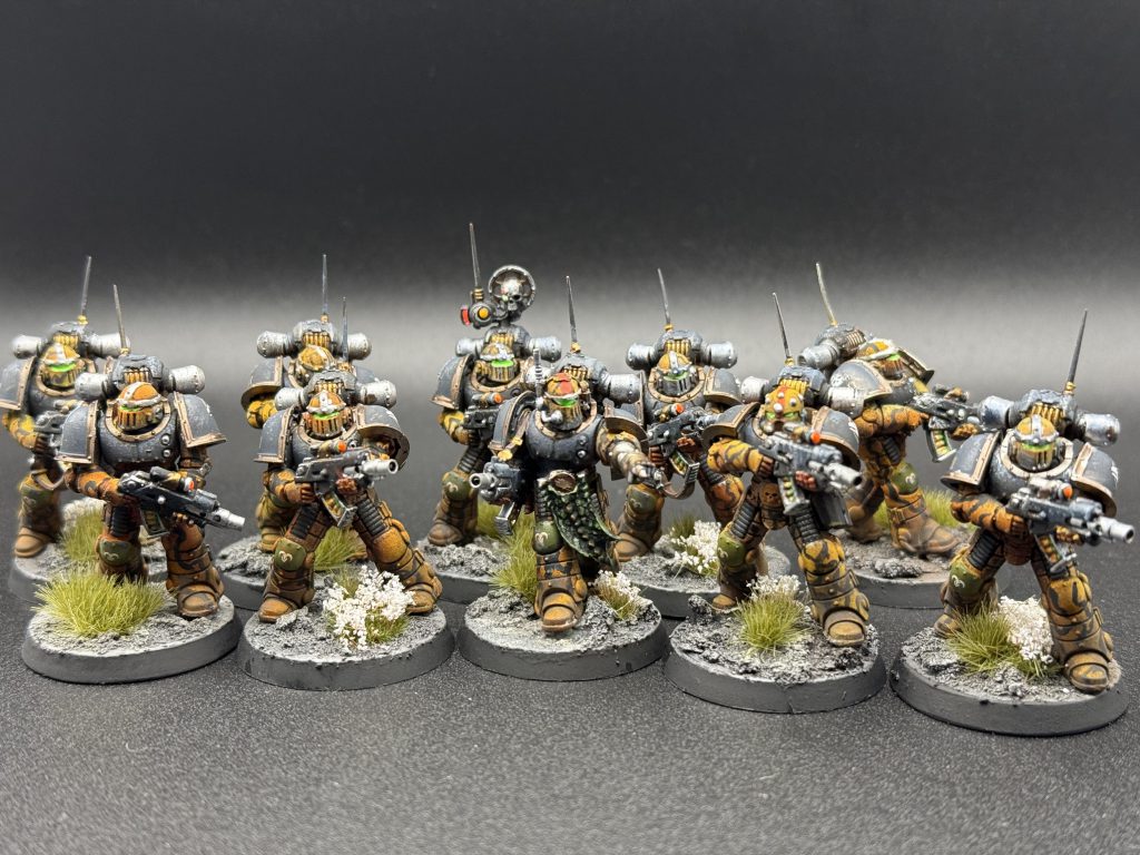 Andrew_N: I had always wanted to build a Veteran/Reconnaissance/Seeker squad in MKII armor for my Salamanders, sporting the Badab War yellow and black camo scheme. So after getting my hands on the new plastics, I knew what I had to do! I built ten of the new guys, and overall I am very happy with them. I have quite a few of the old Forge World resin models in my collection, and these new models have alot more heft to them than they do. They just look CHUNKY – how you would expect early-model power armor (supposedly the first capable of going into space) to look. The return of the monovisor helmets also was a treat.